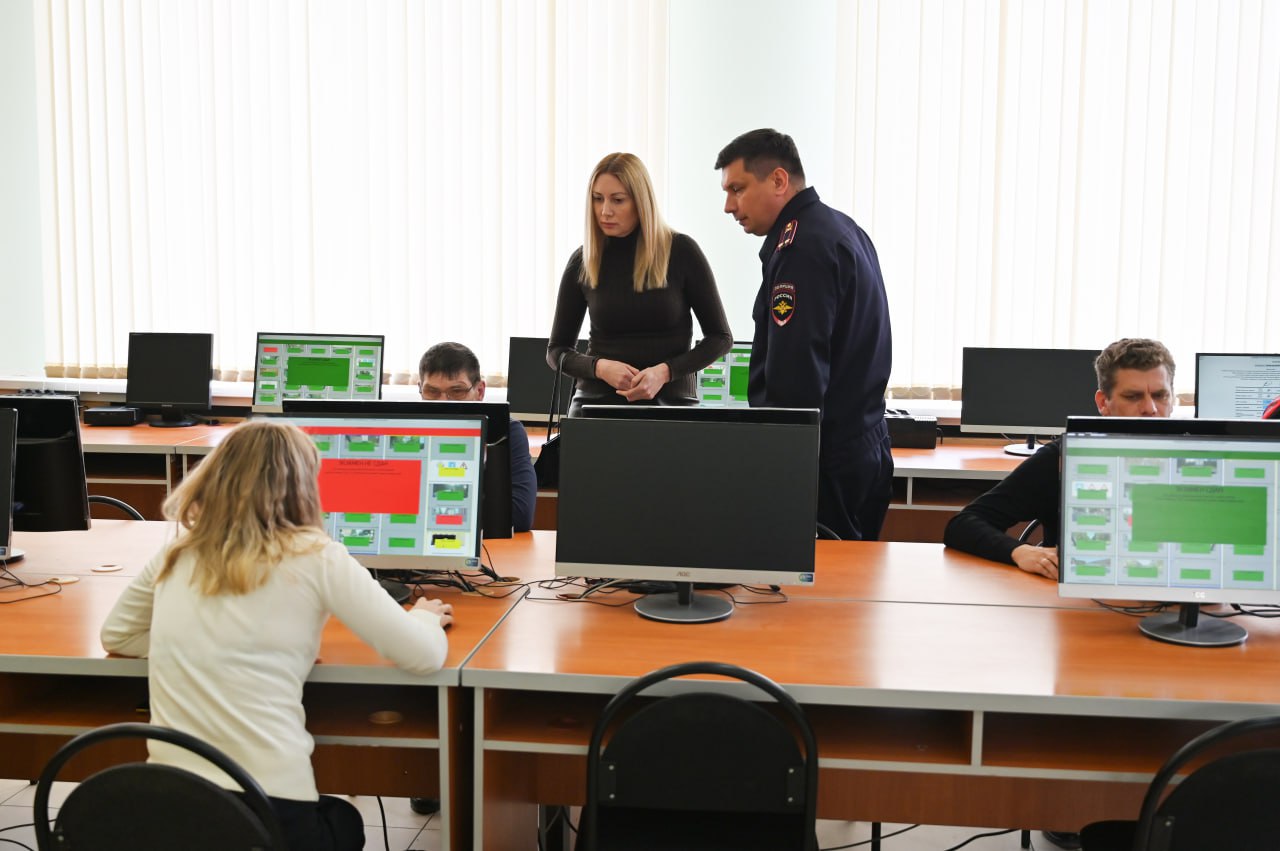 После состоявшегося знакомства Дмитрий Хмелевский сопроводил гостью в учебный класс, где будущие автолюбители за компьютером отвечали на вопросы теоретического экзамена на получение права управления транспортным средством. Каждого испытуемого полицейские досматривали с применением ручного металлодетектора, чтобы исключить возможность использования электронных помощников или шпаргалок. В распоряжении экзаменуемых – только компьютер и полученные во время обучения знания. Не всем удалось справиться с тестом: многим придется прийти на пересдачу.