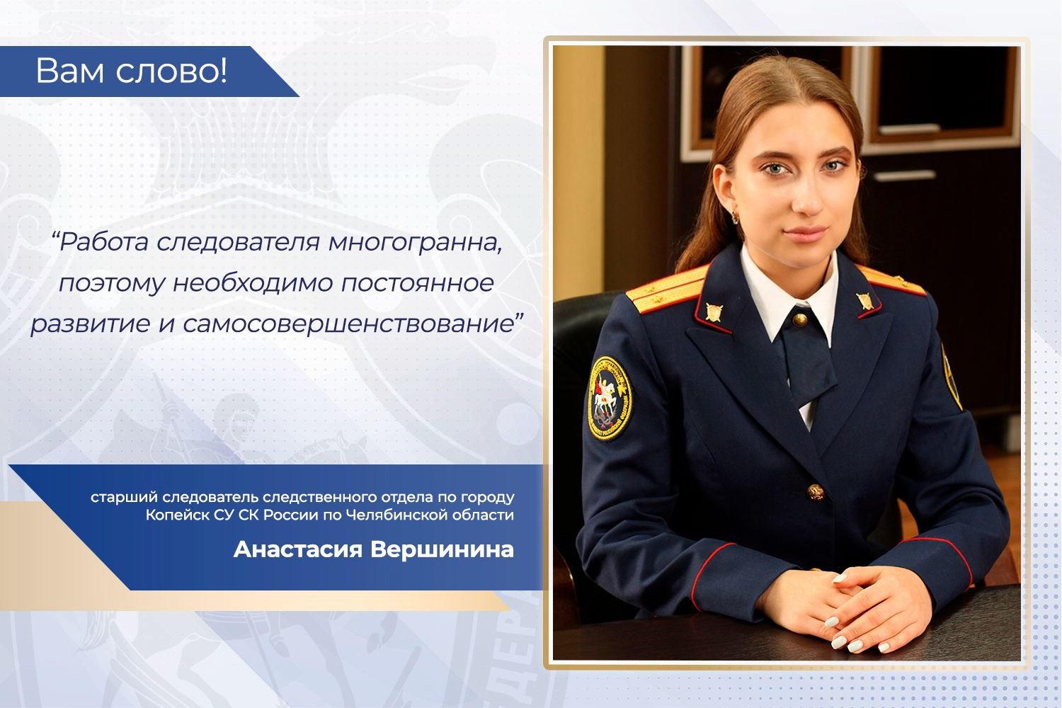 1234Старший следователь следственного отдела по городу Копейск СУ СК России по Челябинской области лейтенант юстиции Вершинина Анастасия Евгеньевна рассказала о своем пути к профессии в рамках ведомственного проекта «Вам слово!»