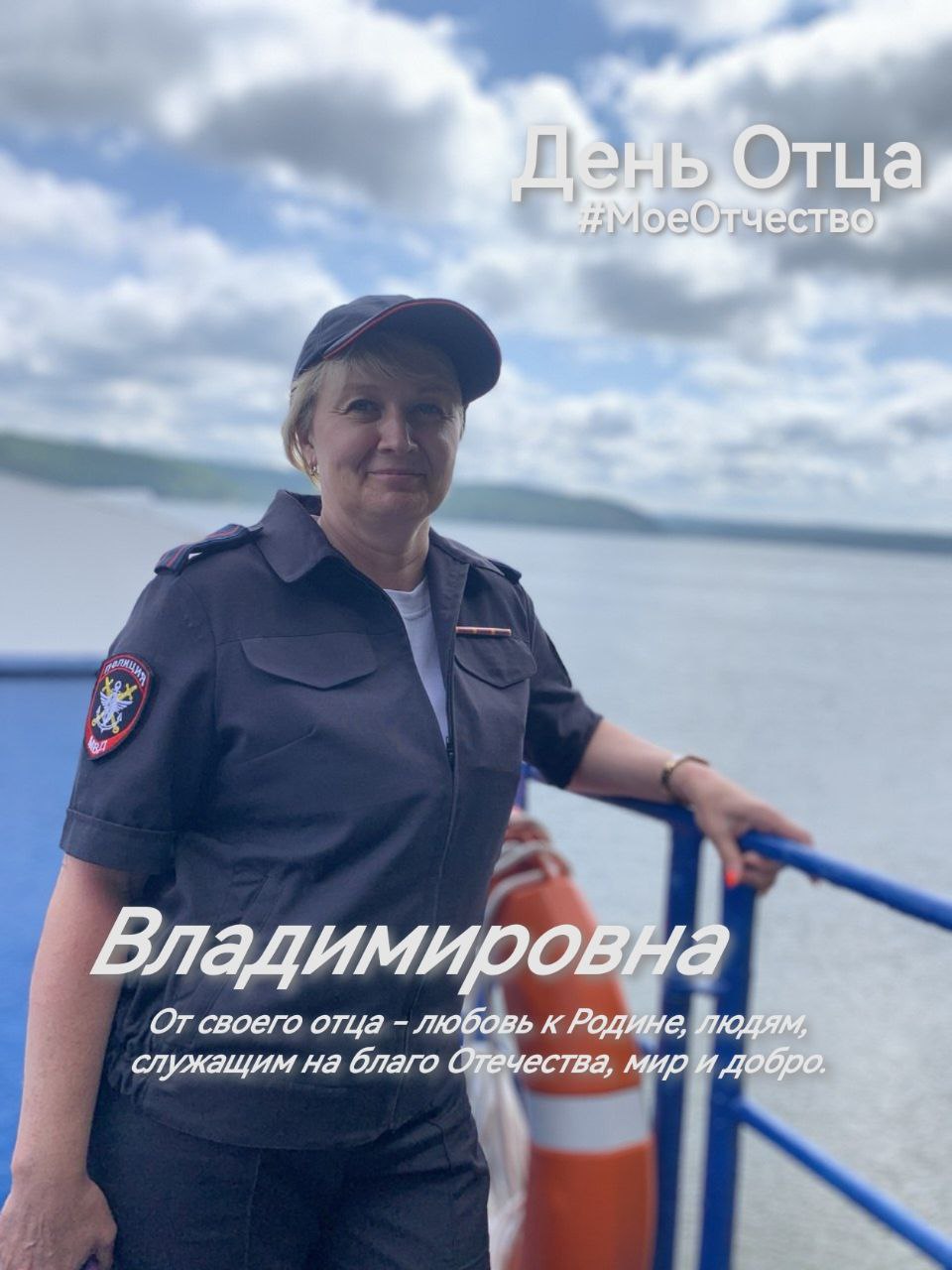 - #МоеОтчество - моё начало, мои истоки, мой путь и моя жизнь. Не только имя влияет на жизнь и судьбу человека, отчество- это первое, главное, с чем мы приходим в этот мир. Мой Владимир- «владеющим миром», мой защитник, моя опора и поддержка. И его маленькая Владимировна - с папиным характером, папиным взглядом и папиной душой. С праздником, мой любимый папа! Спасибо за жизнь, - говорит сотрудник Нижнеудинского линейного отдела полиции Анастасия Ермакова.