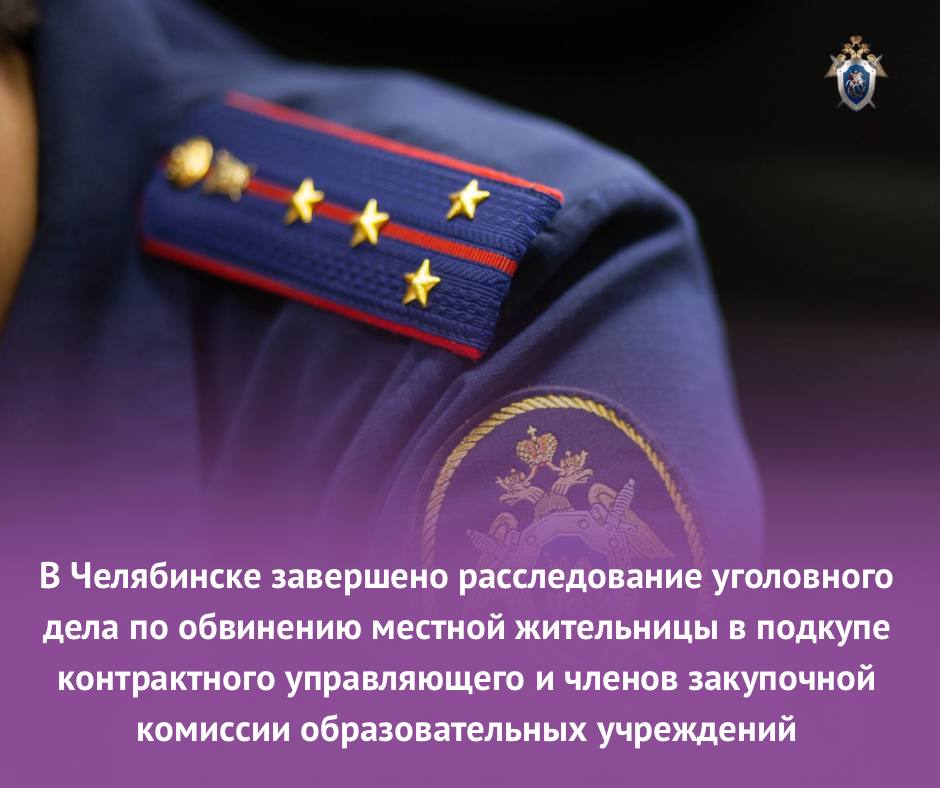Следователем следственного отдела по Ленинскому району города Челябинск регионального СКР завершено расследование уголовного дела по обвинению 43-летней местной жительницы в совершении преступления, предусмотренного ч. 1 ст. 200.5 УК РФ (подкуп работника контрактной службы, контрактного управляющего, члена комиссии по осуществлению закупок), а также двух преступлений, предусмотренных п. "б" ч. 2 ст. 200.5 УК РФ (подкуп работника контрактной службы, контрактного управляющего, члена комиссии по осуществлению закупок в крупном размере).