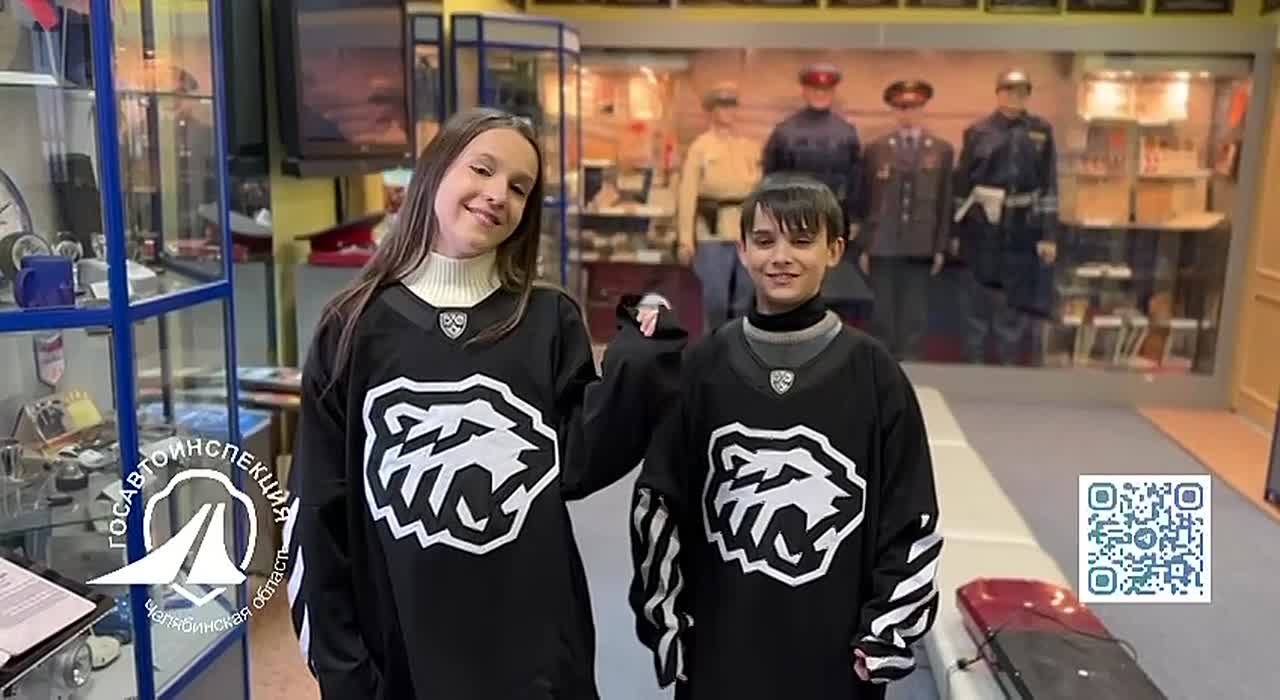Зная, что дети - преданные фанаты хоккейного клуба «Трактор», полицейские подготовили для них памятные футболки, шарфы и шапки с символикой клуба.