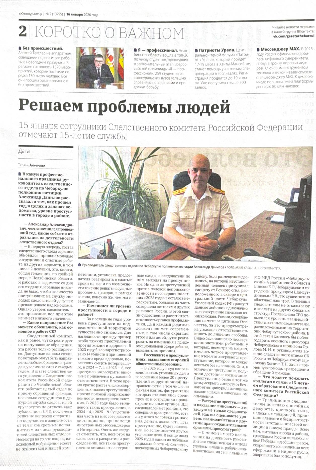 Предлагаем ознакомиться со статьей в газете "Южноуралец" выпуск №2 (13795) от 16 января 2026 года с участием руководителя следственного отдела по городу Чебаркуль регионального СКР Александром Даниловым.