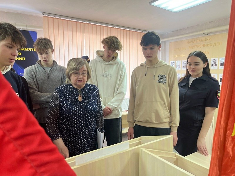 Следующим этапом мероприятия стала экскурсия в комнату истории территориального органа внутренних дел. Её провела Любовь Беспалова — ветеран МО МВД и член общественного совета. Ребята познакомились с историей отдела, увидели архивные фотографии, награды, узнали о подвигах и достижениях кыштымских полицейских разных лет.