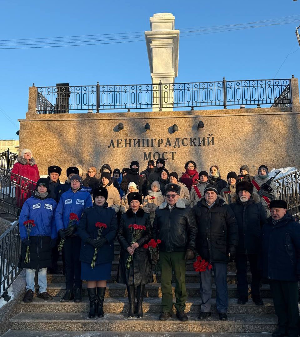 Работники прокуратуры Калининского района г. Челябинска в День 82-летия со дня полного освобождения Ленинграда от фашистской блокады совместно с членами совета ветеранов и юнармейцами - учащимися МАО СОШ № 6 г. Челябинска торжественно возложили цветы к мемориальному знаку, установленному на Ленинградском мосту.