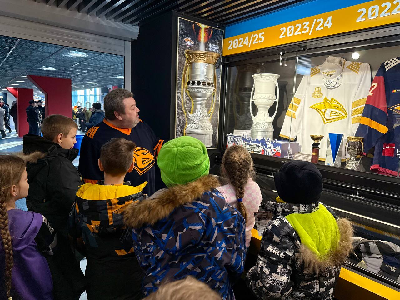 Перед началом игры для юных гостей состоялась эксклюзивная экскурсия по легендарной «Арене-Металлург». Ребята смогли не только пройти по закулисным помещениям, но и побывать в музее клуба, где с большим интересом рассматривали экспонаты. Особое внимание привлек главный трофей – «Золотая клюшка», символ побед и спортивной славы магнитогорской команды. Золотую именную клюшку в 2017 году получил в подарок капитан магнитогорского «Металлурга» Сергей Мозякин. Хранящаяся в музее клюшка — точная копия настоящей игровой клюшки хоккеиста, на ней есть памятная надпись, а вдоль черенка — отметки о каждом сотом набранном очке Мозякина, вплоть до тысячного.