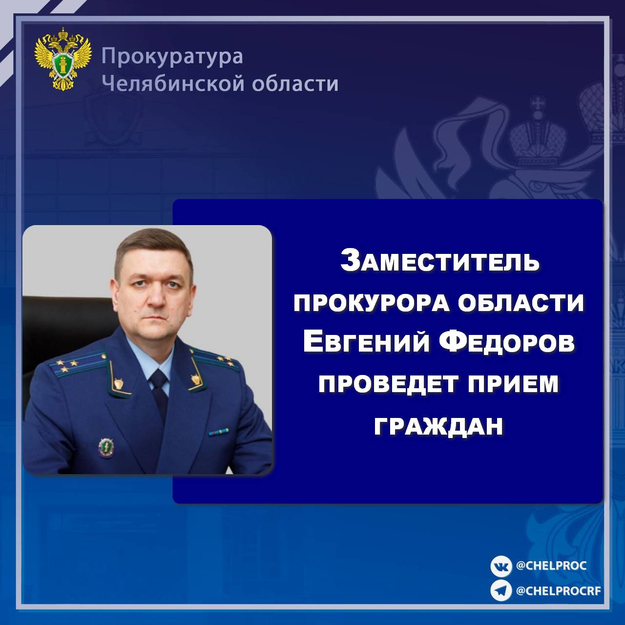 Заместитель прокурора области Евгений Федоров проведет личный прием граждан в городе Миассе по вопросам, связанным с рассмотрением уголовных дел судами, исполнением уголовных наказаний