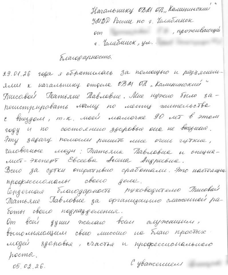 В Управление по вопросам миграции ГУ МВД России по Челябинской области поступило благодарственное письмо от жительницы Калининского района. Гузелия Варисовна выразила признательность сотрудникам районного отдела полиции за оперативное решение вопроса, связанного с регистрационным учетом.