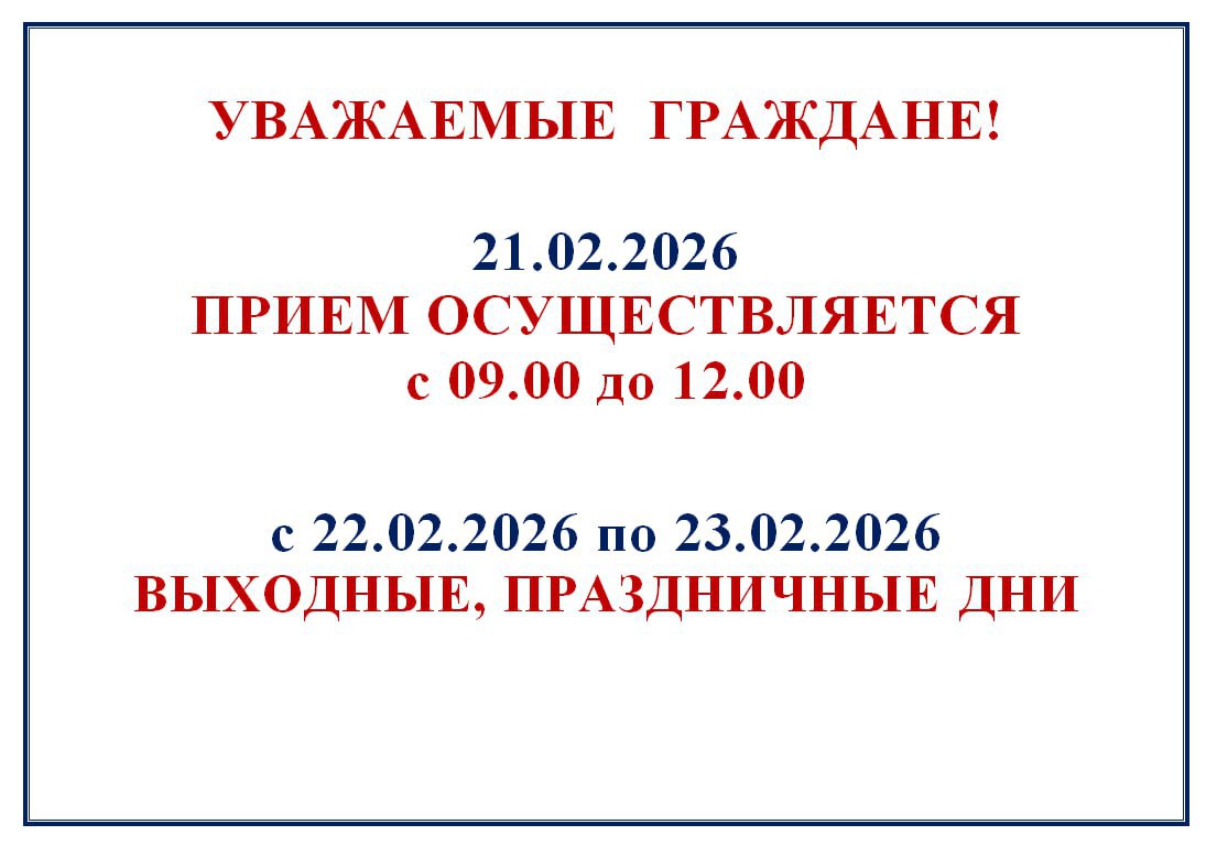 Уважаемые жители и гости Южного Урала! 21 февраля 2026 года прием граждан будет осуществляться с 09:00 до 12:00. С 22 по 23 февраля 2026 года – выходные, праздничные дни.