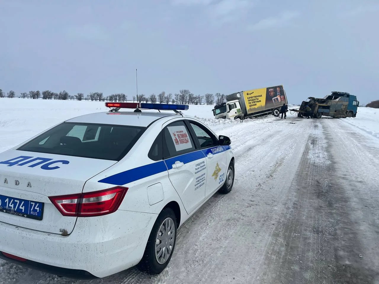 В дежурную часть полиции поступило сообщение о дорожно-транспортном происшествии на 5-м километре автодороги Троицк – Степное. Прибывшие на место экипаж ДПС в составе старших лейтенантов полиции Павла Воронюка и Дмитрия Притыкина установили, что водитель из Еманжелинска, перевозивший товар, не учел сложные погодные условия, выбрал небезопасную скорость и совершил съезд в кювет.