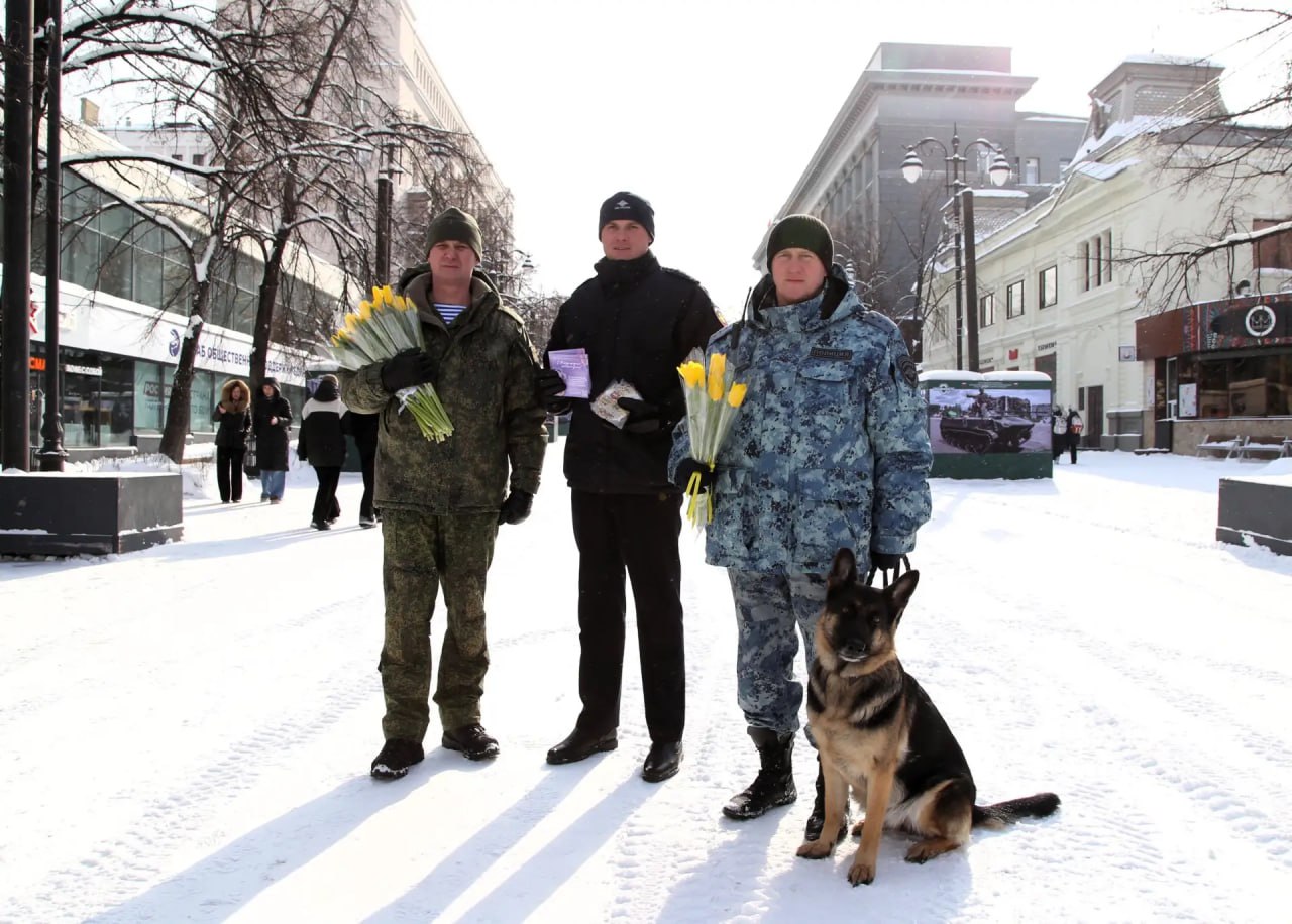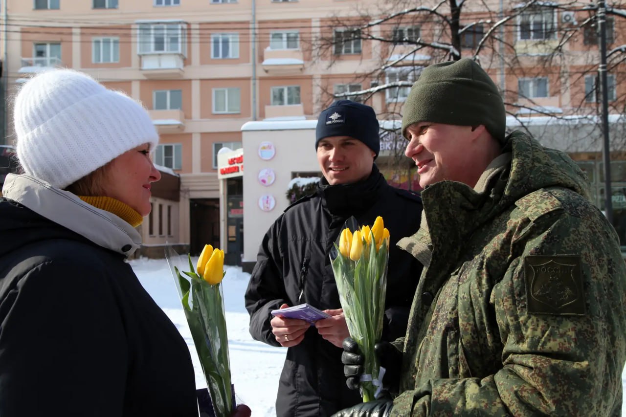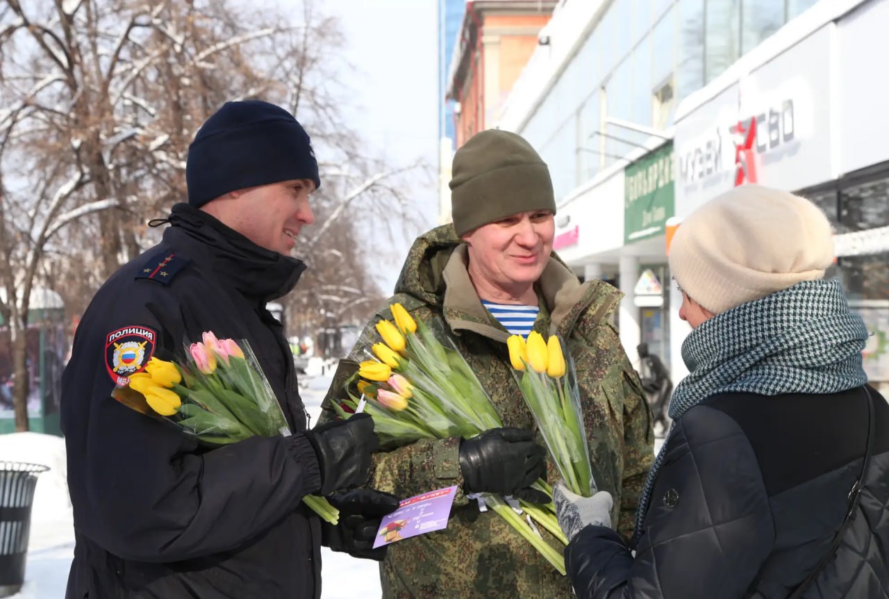 В преддверии Международного женского дня сотрудники полиции совместно с представителем Общественного совета при ГУ МВД России по Челябинской области Сергеем Бормотовым вышли на главную пешеходную улицу города, чтобы поздравить дам с наступающим праздником.