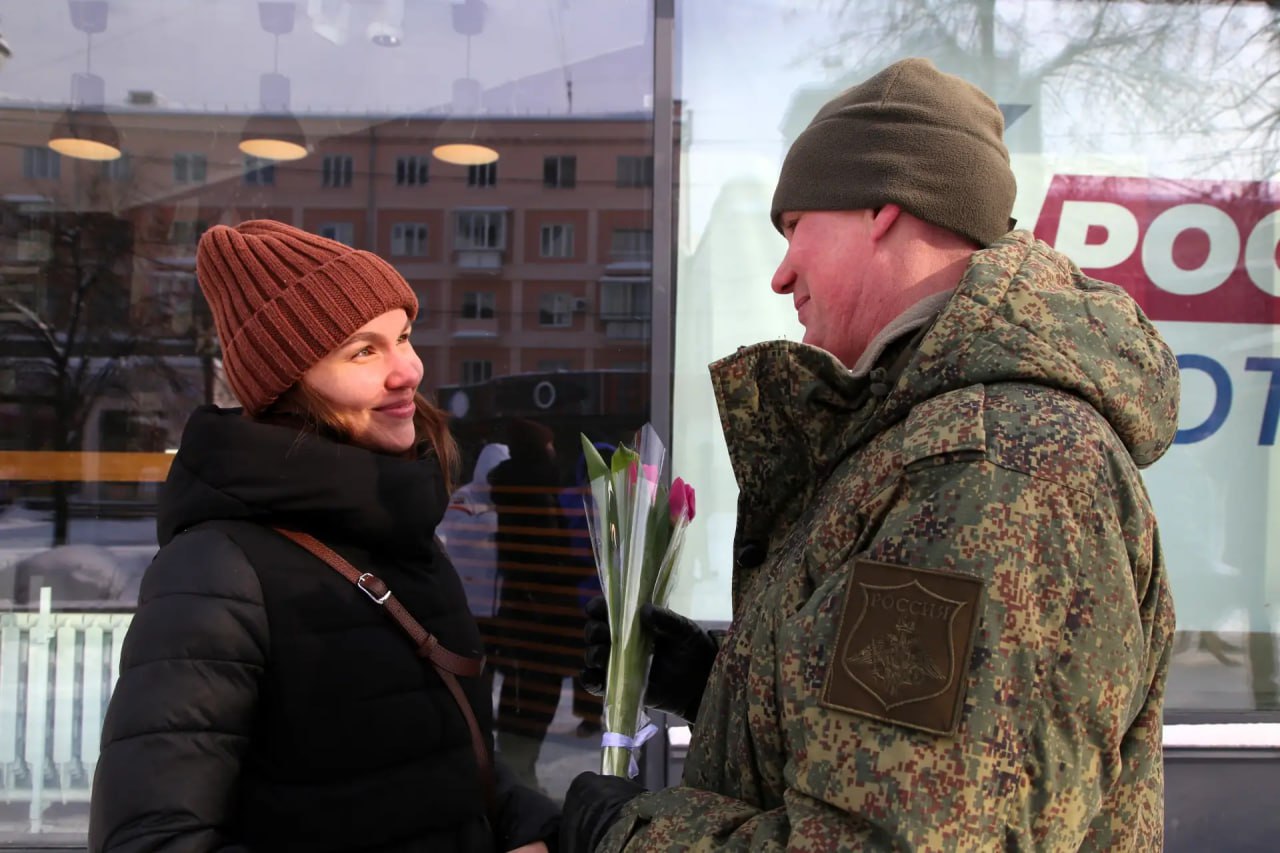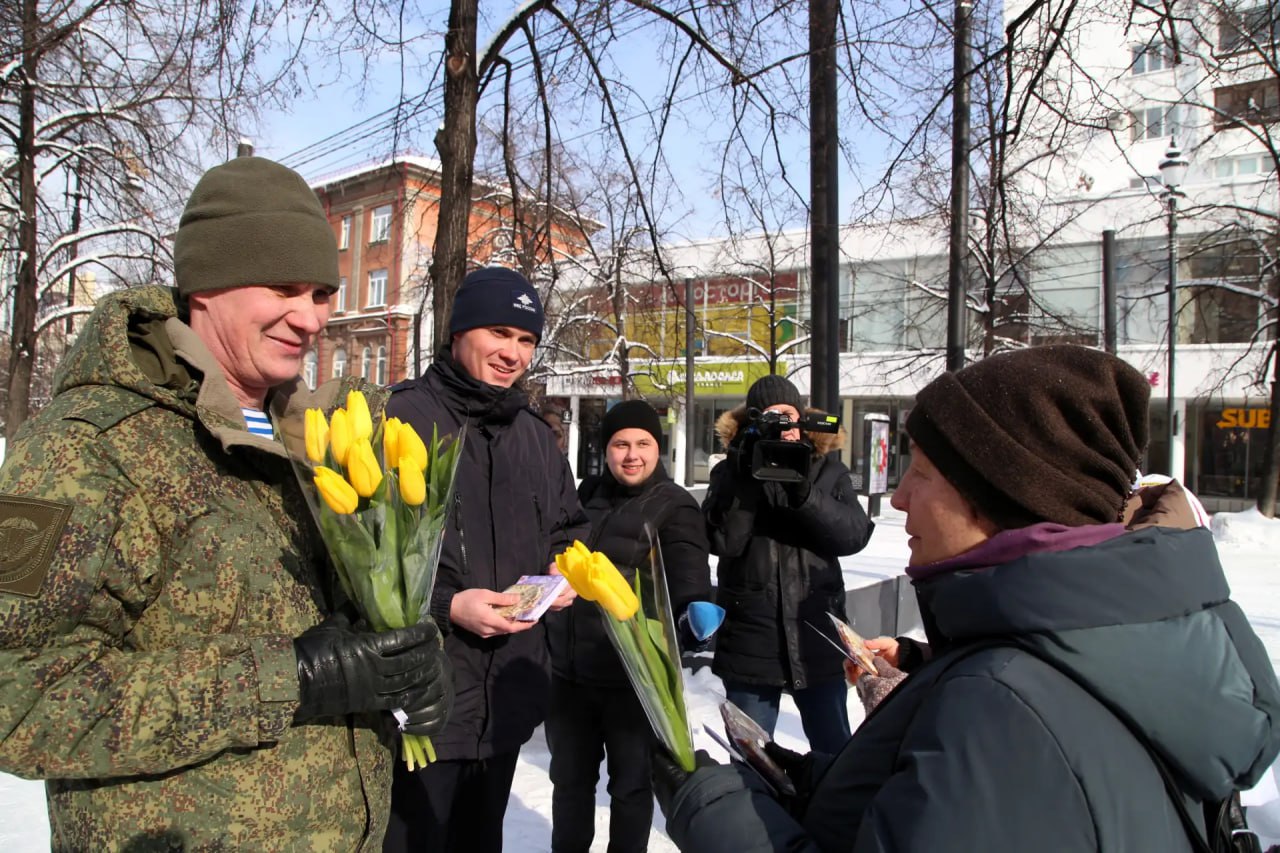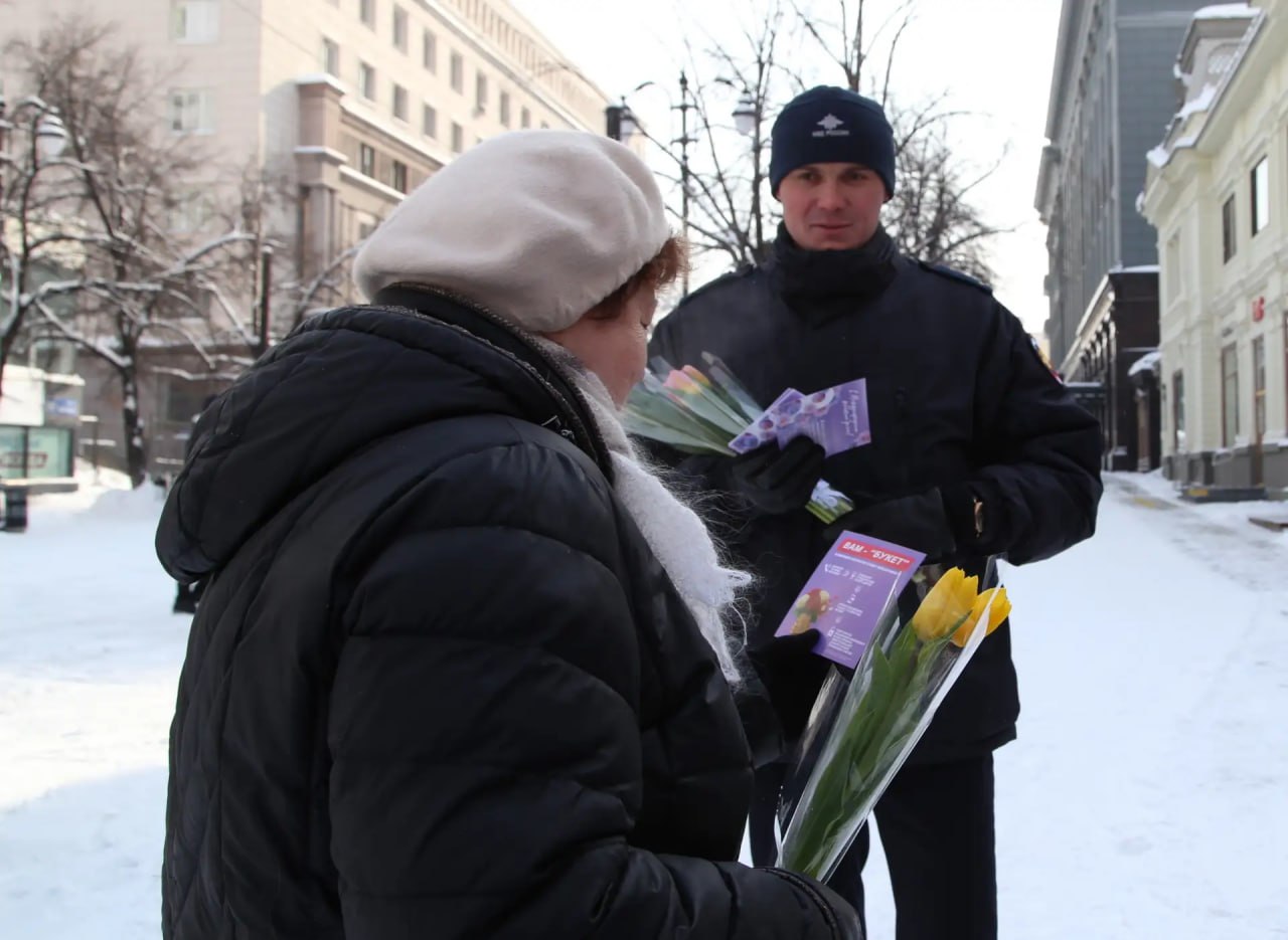 Старший инспектор отдела охраны общественного порядка УМВД России по г. Челябинску Максим Кудрявцев дарил женщинам не только цветы, но и тематические открытки. На их обороте размещена важная профилактическая информация об актуальной мошеннической схеме «Вам — букет!».