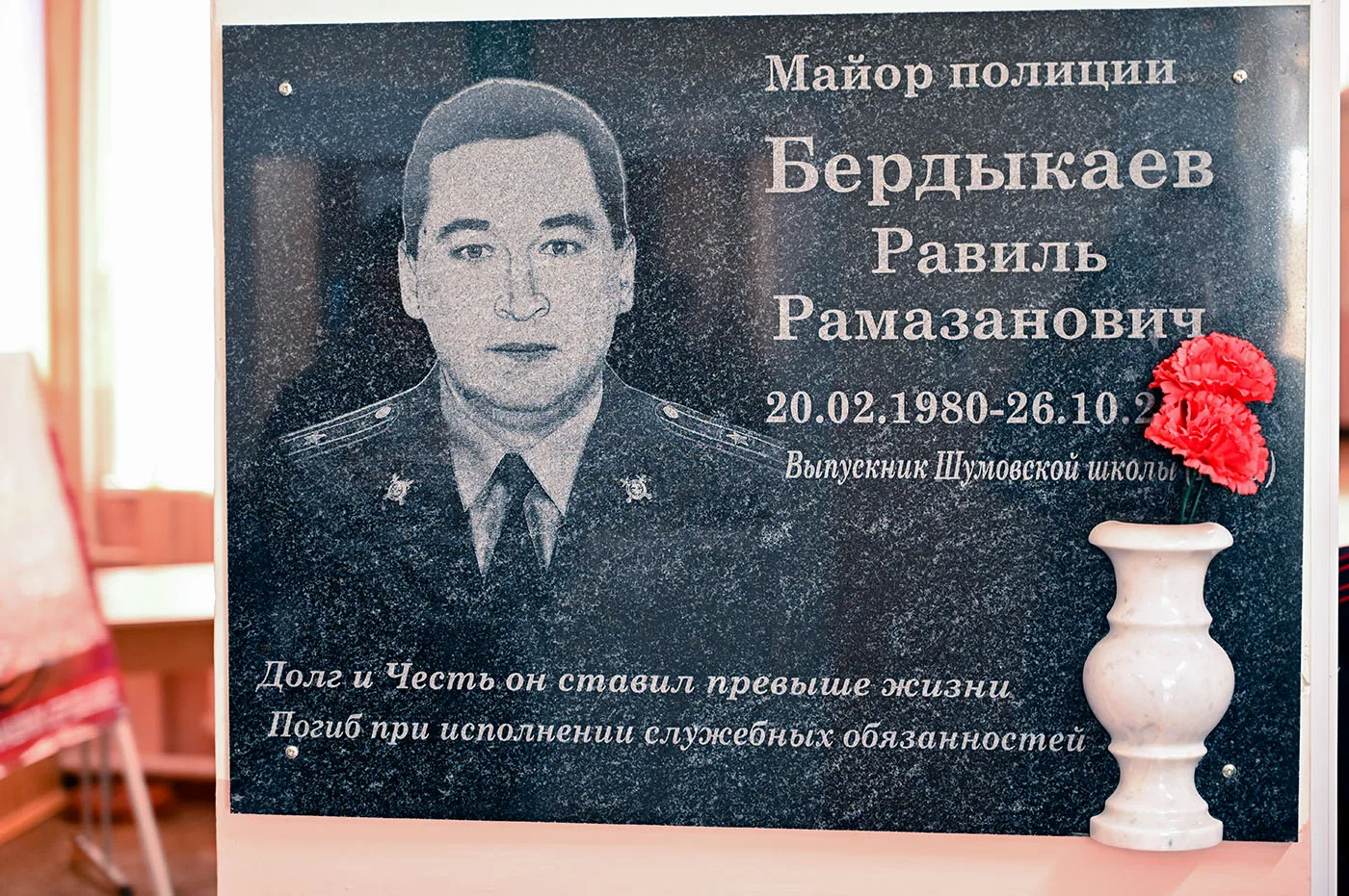 Южноуралец Равиль Бердыкаев с честью и достоинством прошел свой жизненный путь. За время работы в органах внутренних дел Приуральского района майор полиции получил 14 поощрений. За год до трагедии им было раскрыто по горячим следам 17 из 19-ти зарегистрированных в селе преступлений. Его подвиг – яркий пример отваги и мужества, беззаветного служения долгу и готовности рисковать собственной жизнью ради безопасности граждан. В память о Равиле Рамазановиче установлена мемориальная доска в школе, где он учился, построена мечеть, возведение которой стало возможным благодаря инициативе родителей героя – Рамазану и Мунире Бердыкаевым, а также поддержке неравнодушных жителей района.