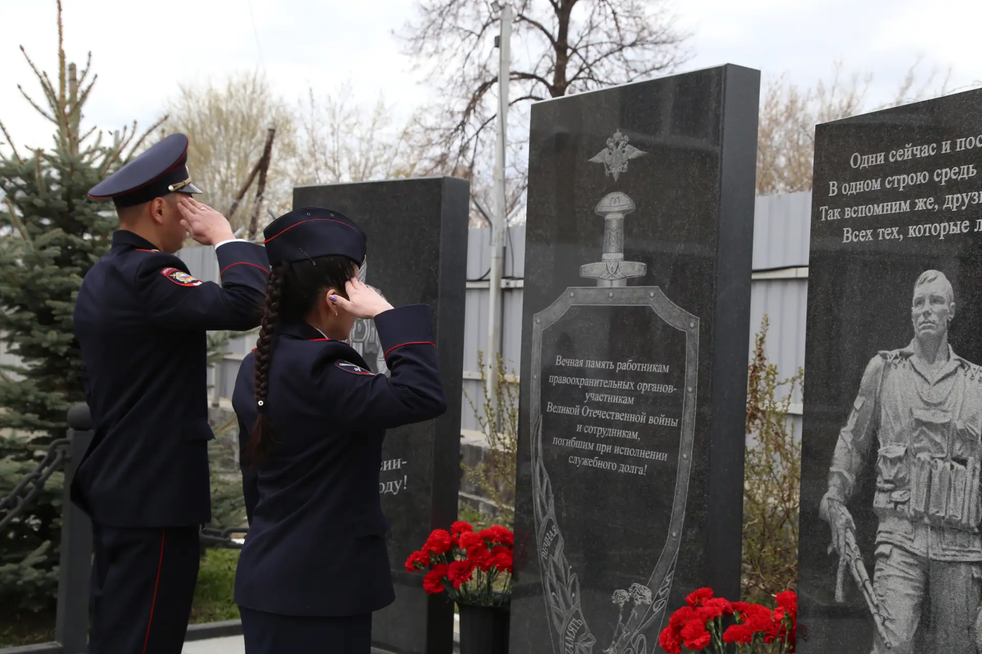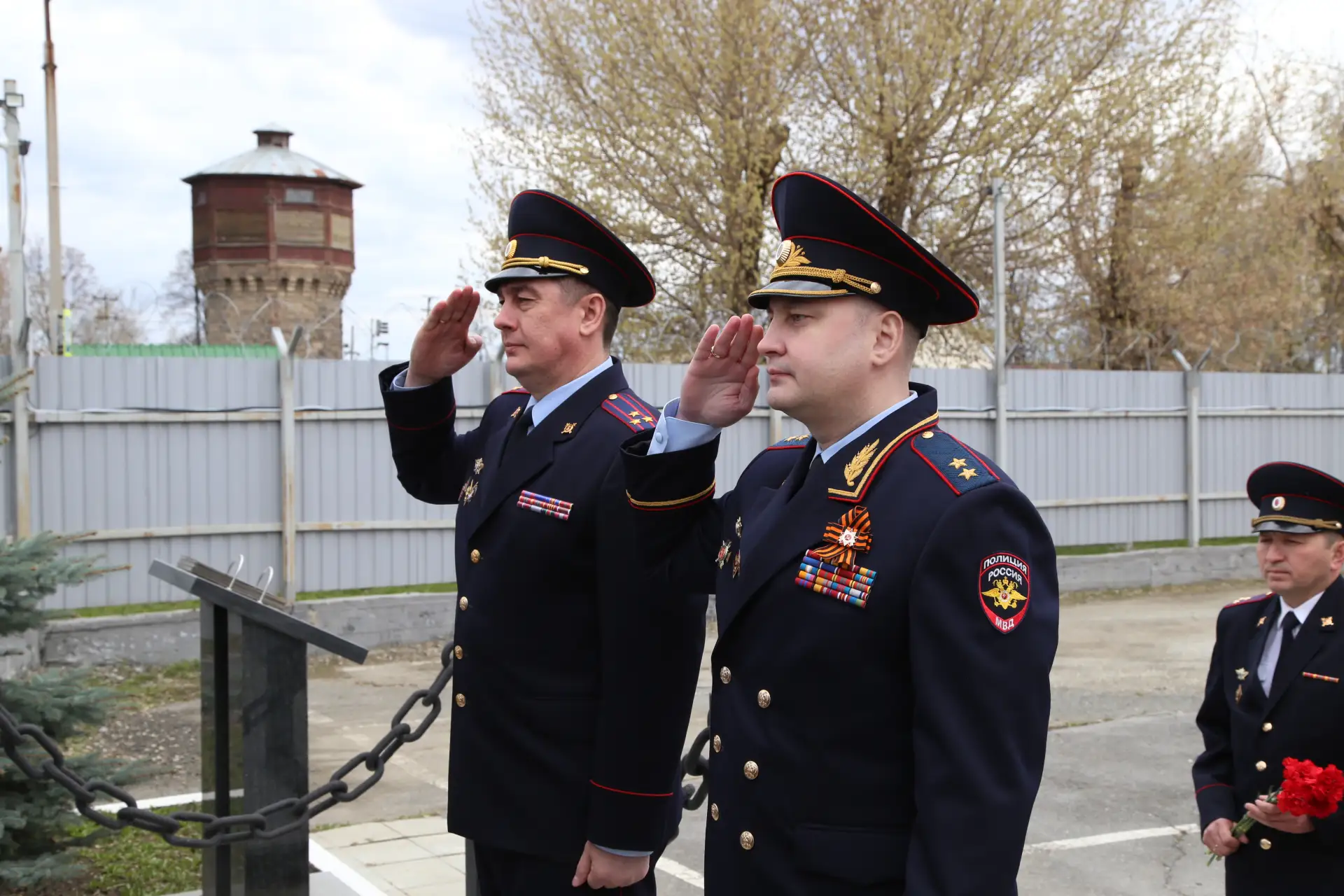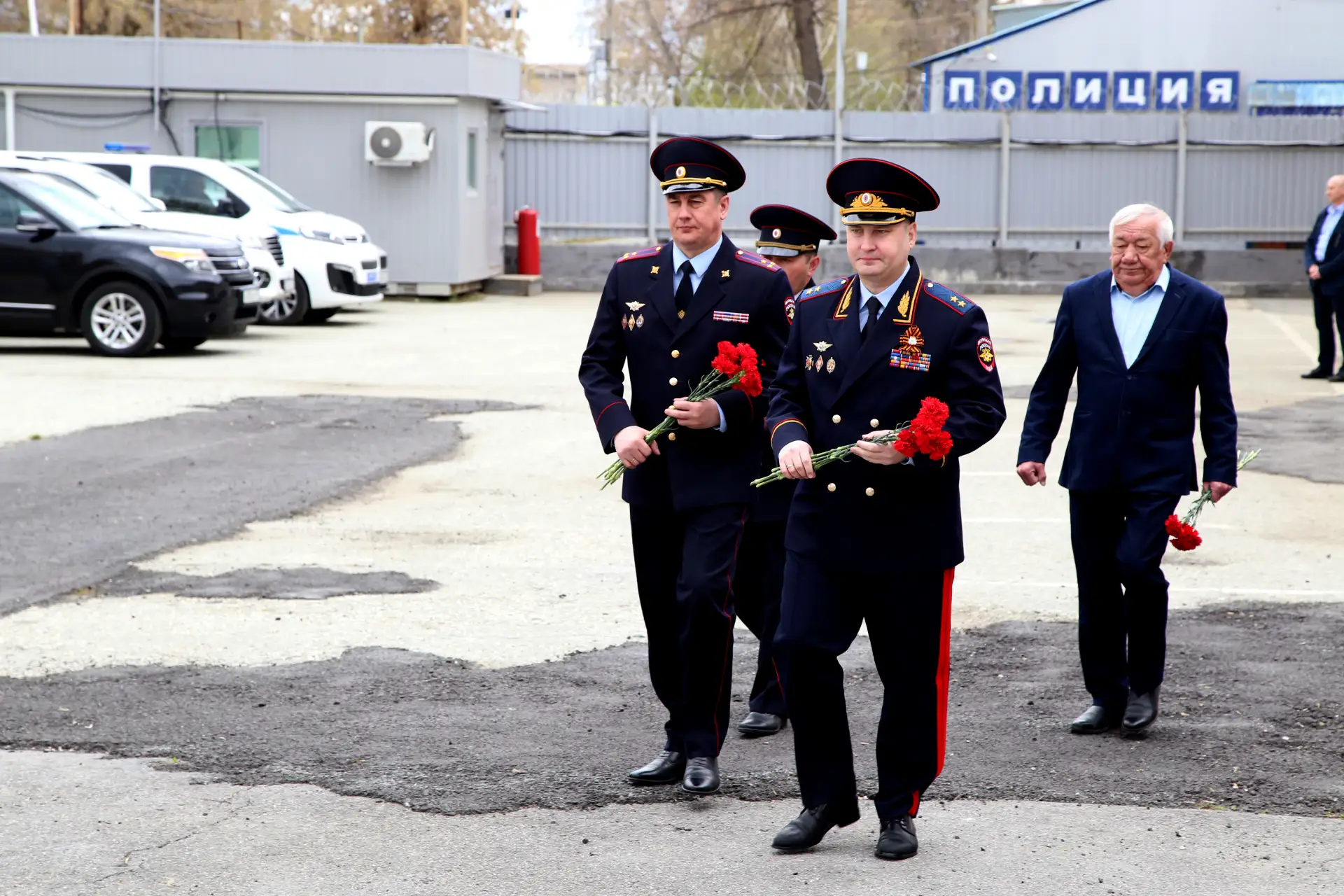 По традиции свой визит главный полицейский региона начал с возложения цветов к мемориальному комплексу. Он состоит из трёх памятных стел — в честь ветеранов Великой Отечественной войны, сотрудников МВД, погибших при исполнении служебного долга, а также участников контртеррористических операций.