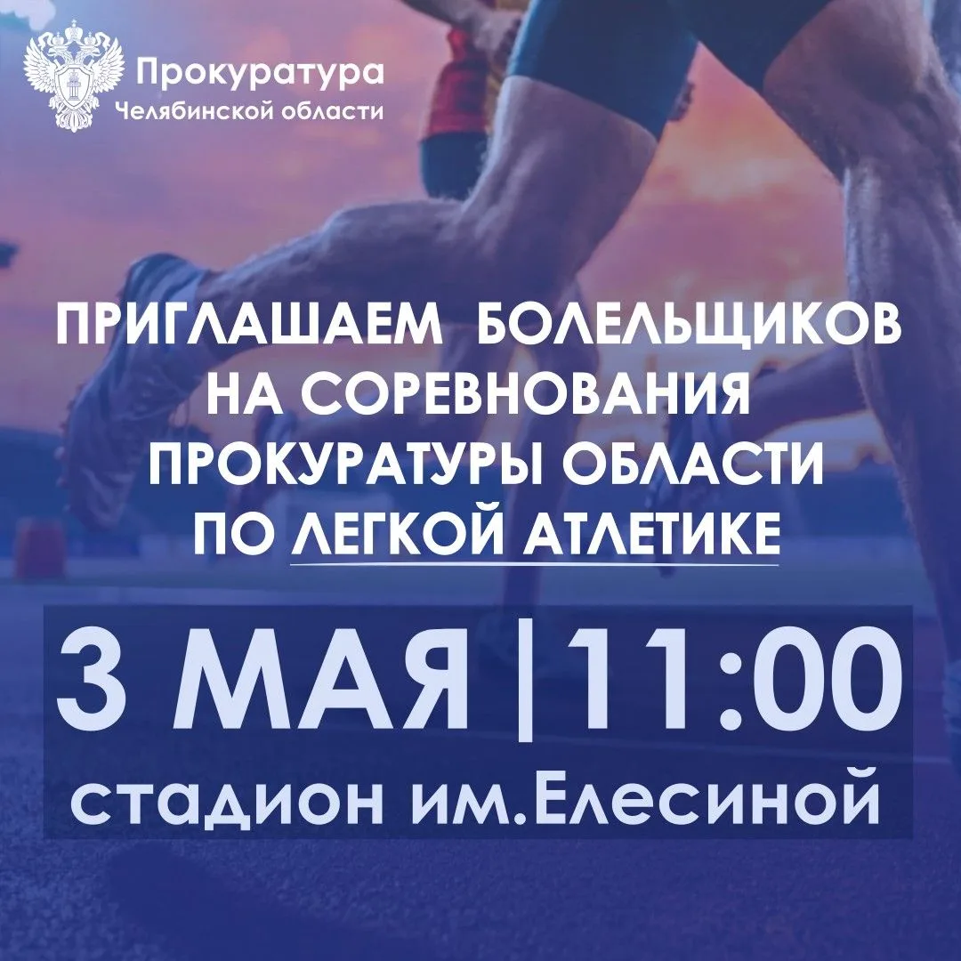 В воскресенье 03 мая 2026 года в 11:00 в легкоатлетическом комплексе им. Елесиной (пр. Ленина, 84 г. Челябинск) состоятся соревнования прокуратуры области по легкой атлетике, посвященные Дню Победы в Великой Отечественной войне.