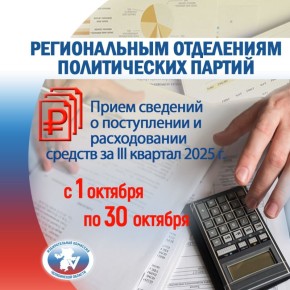 Продолжается прием финансовых отчетов региональных отделений политических партий за 3 квартал 2025 года. Срок представления отчётов – не позднее 30 октября 2025 года Нарушение сроков представления сведений о поступлении и расходовании средств...