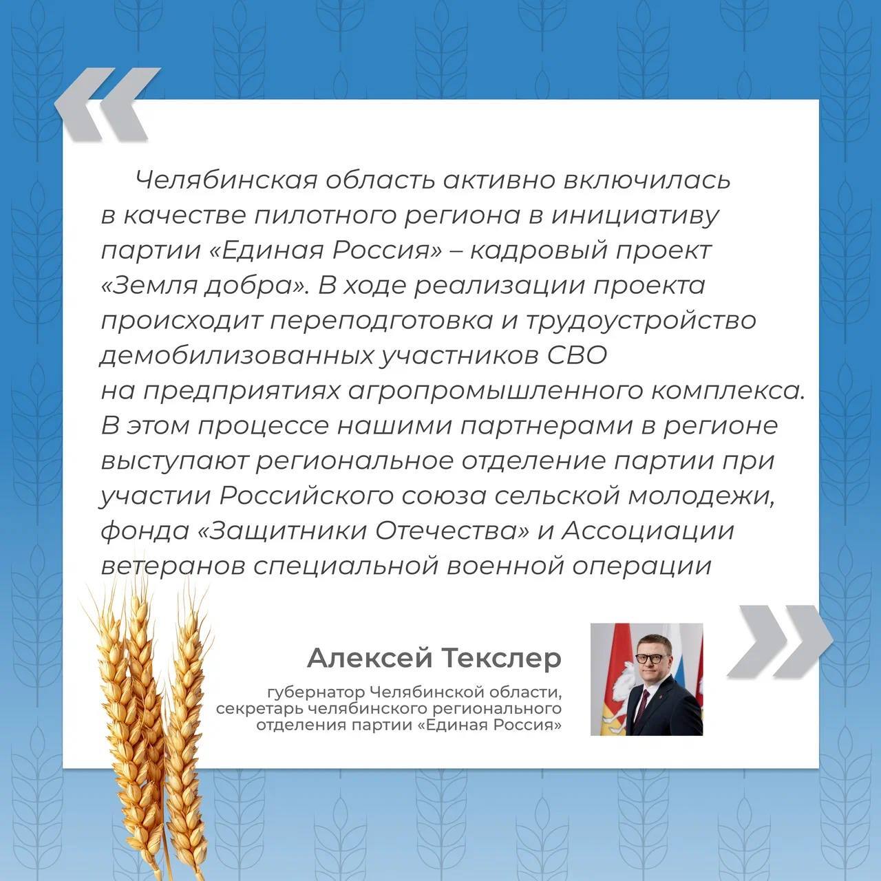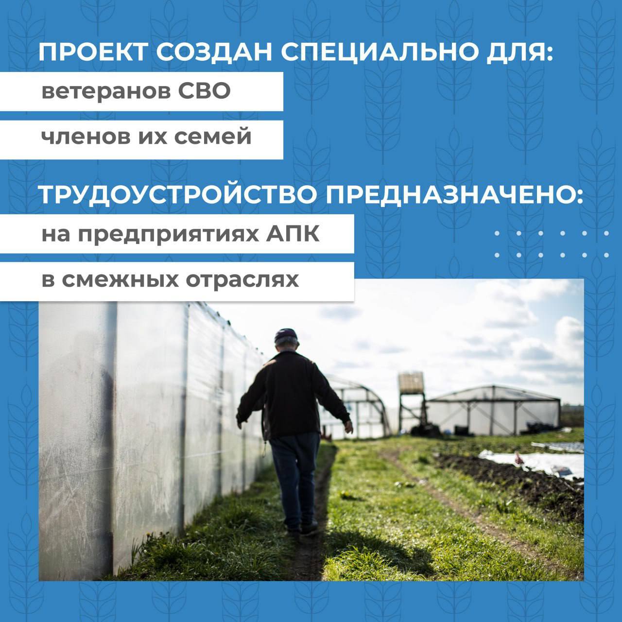 Благодаря проекту бойцы и члены их семей могут переучиться и устроиться на новую работу в агропредприятия региона. Кроме того, ветераны СВО получат поддержку в открытии собственного агробизнеса. Партнёрами проекта на Южном Урале стали: Челябинское региональное отделение партии «Единая Россия», Российский союз сельской молодёжи, фонд «Защитники Отечества» и Ассоциация ветеранов СВО.