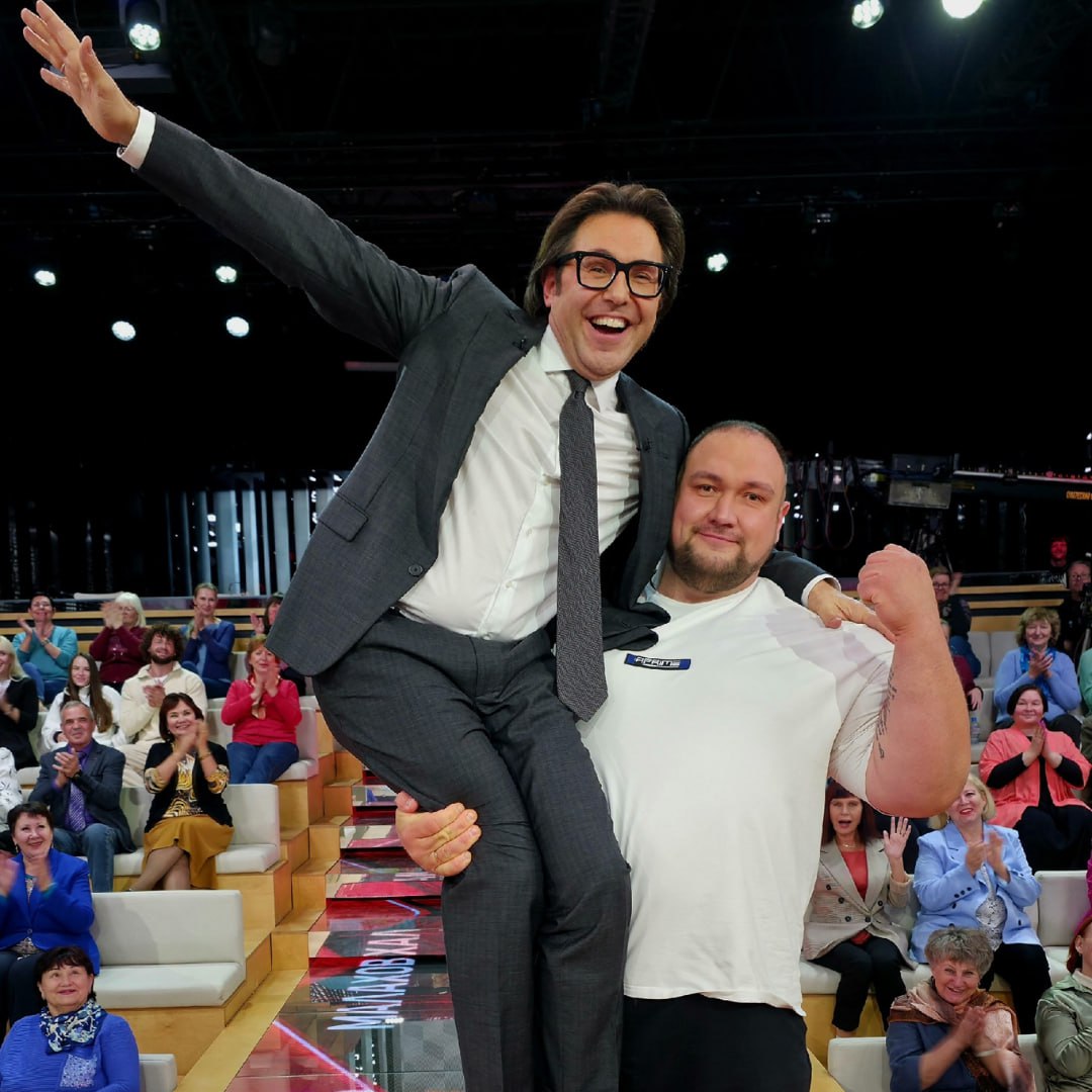 В студии измерили обхват бицепса – 66 см, но раньше, уверяет спортсмен, было 69.