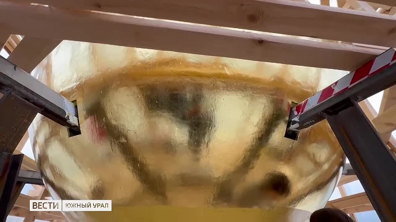 Огромный шар покрывают сусальным золотом в Челябинске