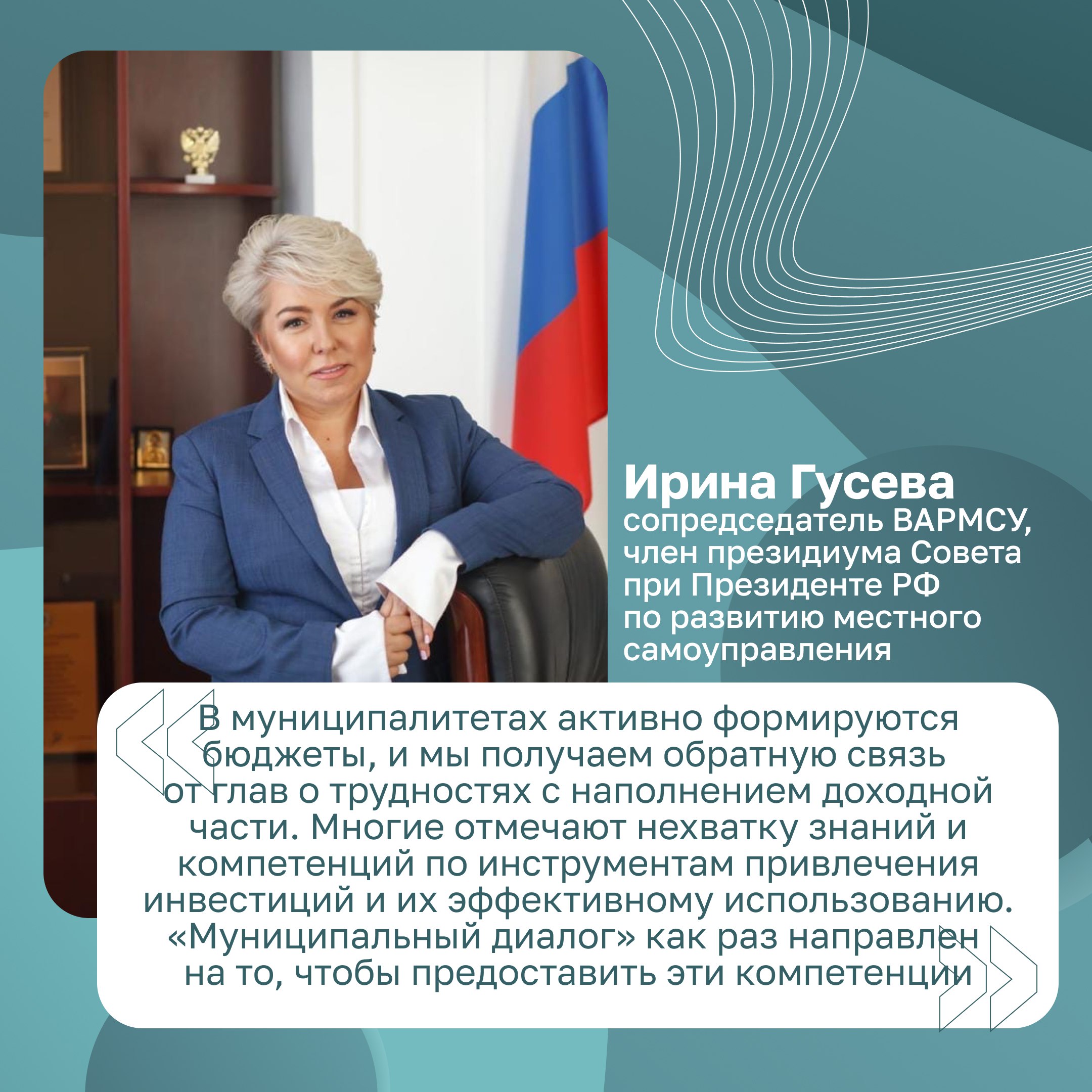 Сопредседатель ВАРМСУ, член президиума Совета при Президенте РФ по развитию местного самоуправления Ирина Гусева привела реальный пример — главам муниципалитетов не всегда хватает компетенций для привлечения бюджета и его эффективного использования. А «Муниципальный диалог» как раз направлен на то, чтобы предоставить эти компетенции.