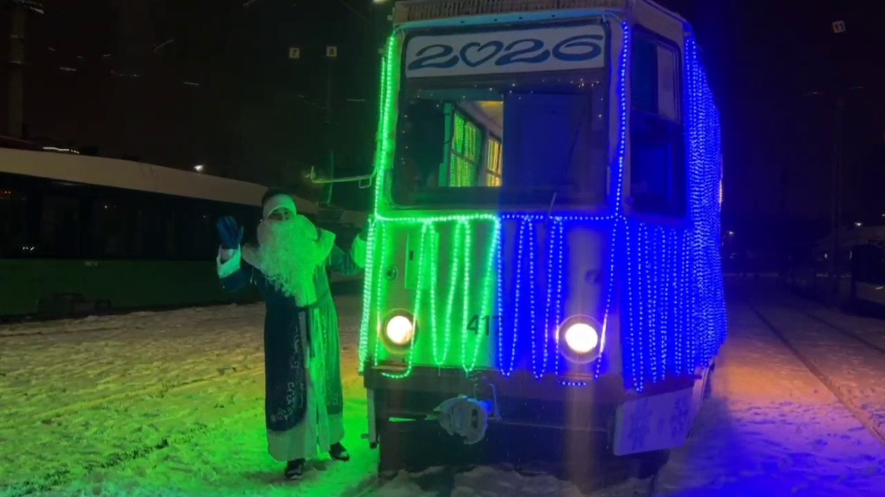 Новогоднее настроение: в Челябинске начал ездить трамвай-гирлянда