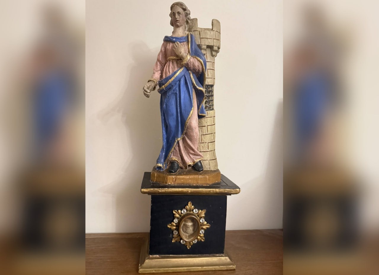 Его украшает фигура святой возле башни, куда ее запер отец от посторонних глаз. Именно там она пришла к вере.