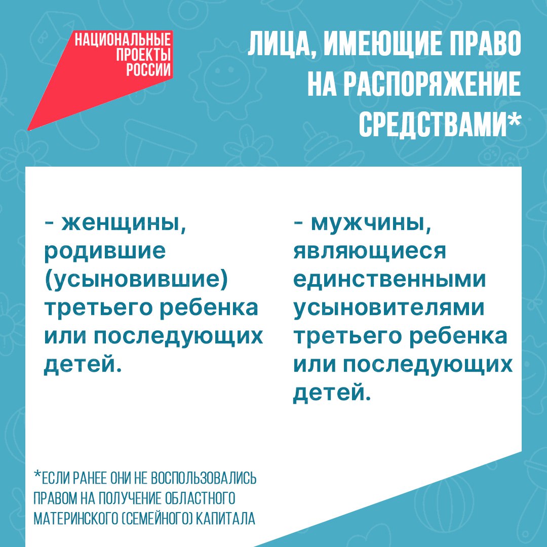 Областной материнский капитал предоставляют при рождении третьего и последующих детей, если среднедушевой доход меньше двух прожиточных минимумов. Чаще всего родители направляют деньги на улучшение жилищных условий, образование и оплату медицинских услуг. Помощь оказывают в рамках нацпроекта "Семья".