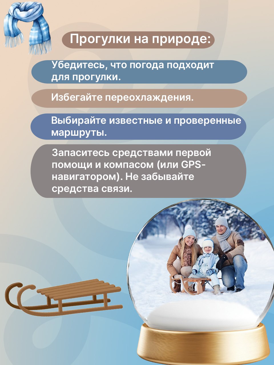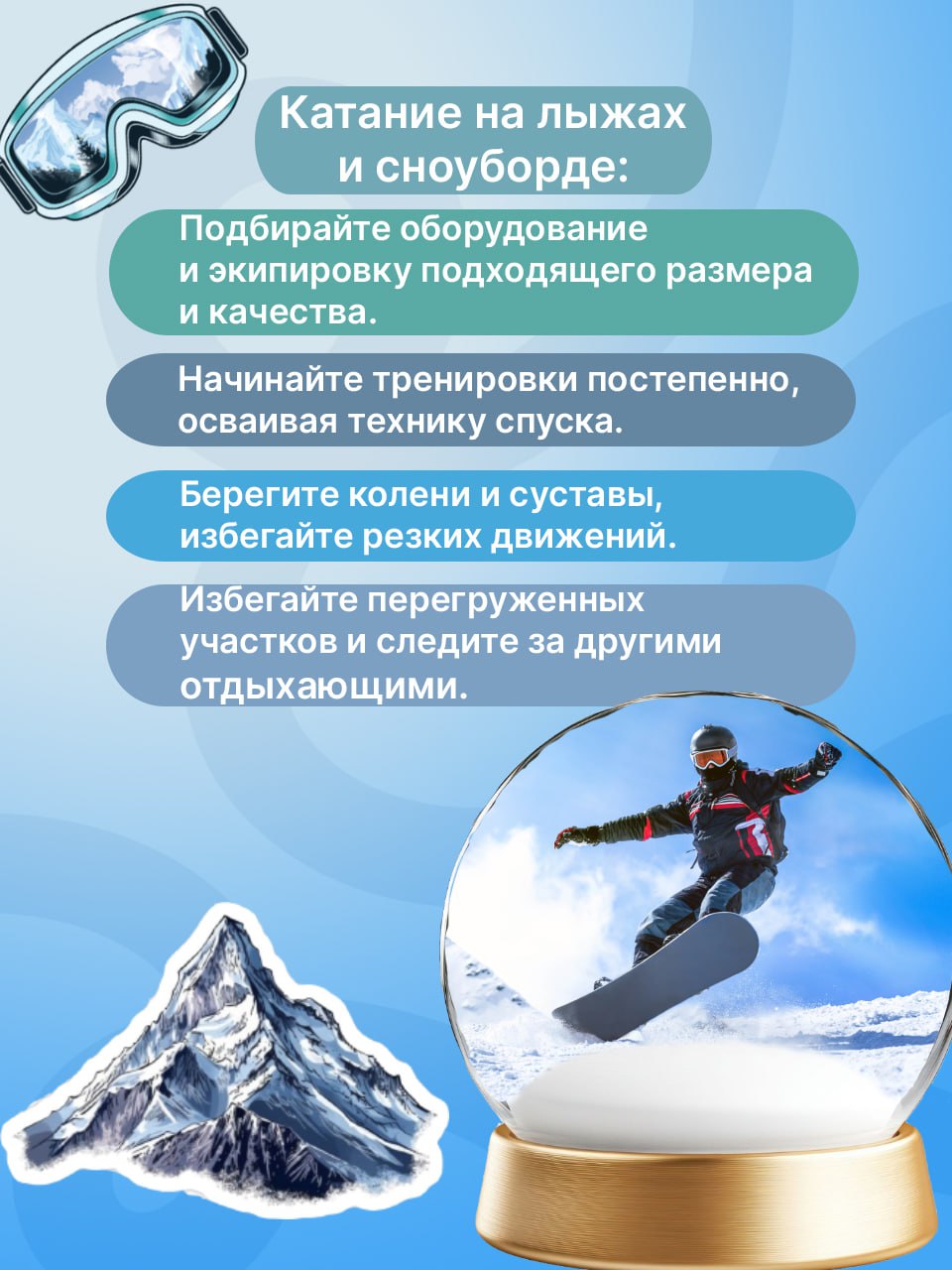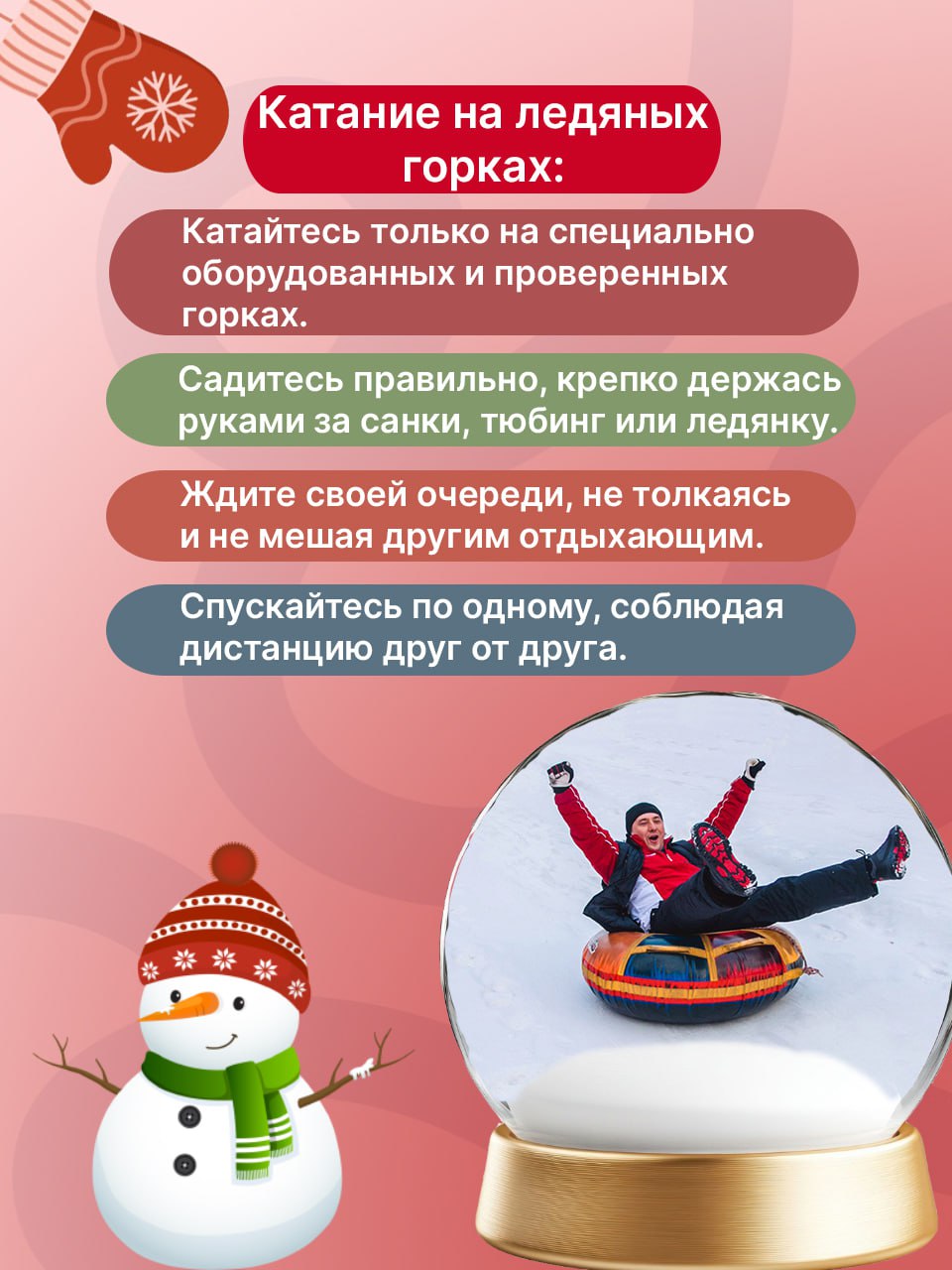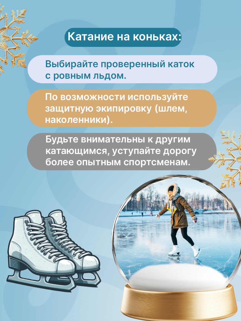 В этих карточках рассказываем о наиболее важных правилах. Следуя этим простым рекомендациям, вы сможете насладиться зимними развлечениями без риска для себя и окружающих.