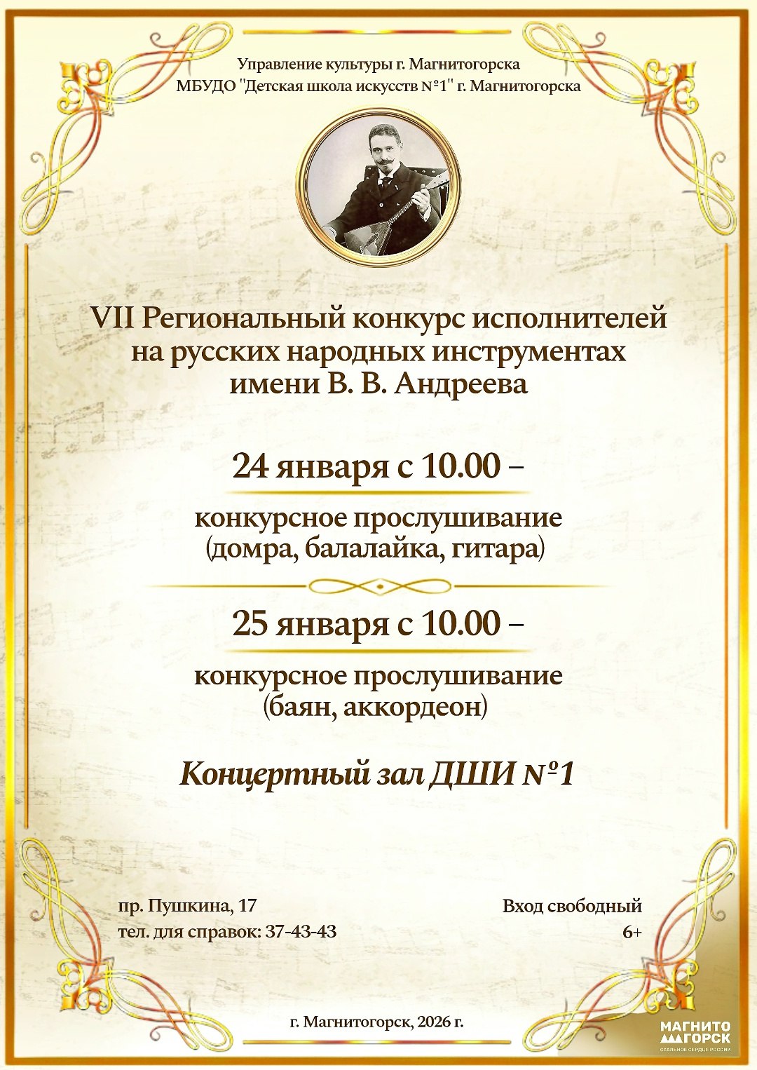 В год единства народов России 24 и 25 января в Детской школе искусств №1 состоится VII Региональный конкурс исполнителей на русских народных инструментах им. В.В. Андреева. Конкурс призван сохранять, развивать и приумножать лучшие культурные и исполнительские традиции России. Региональный конкурс объединит более 130 юных музыкантов в возрасте от 7 до 17 лет Южного Урала и республики Башкортостан, играющих на баяне, аккордеоне, гитаре, домре и балалайке. Магнитогорск представят исполнители на народных инструментах из детских школ искусств №1, №2, №4, №6, №7, «Дом музыки», «Камертон», Детской музыкальной школы №3, колледжа культуры и искусства Магнитогорской государственной консерватории им. М. И. Глинки. На конкурсной сцене солисты и ансамбли должны будут сыграть обработку народной песни или танца и инструментальную пьесу.