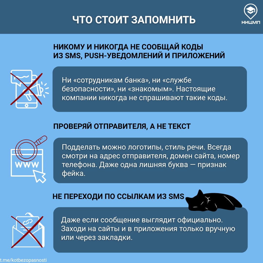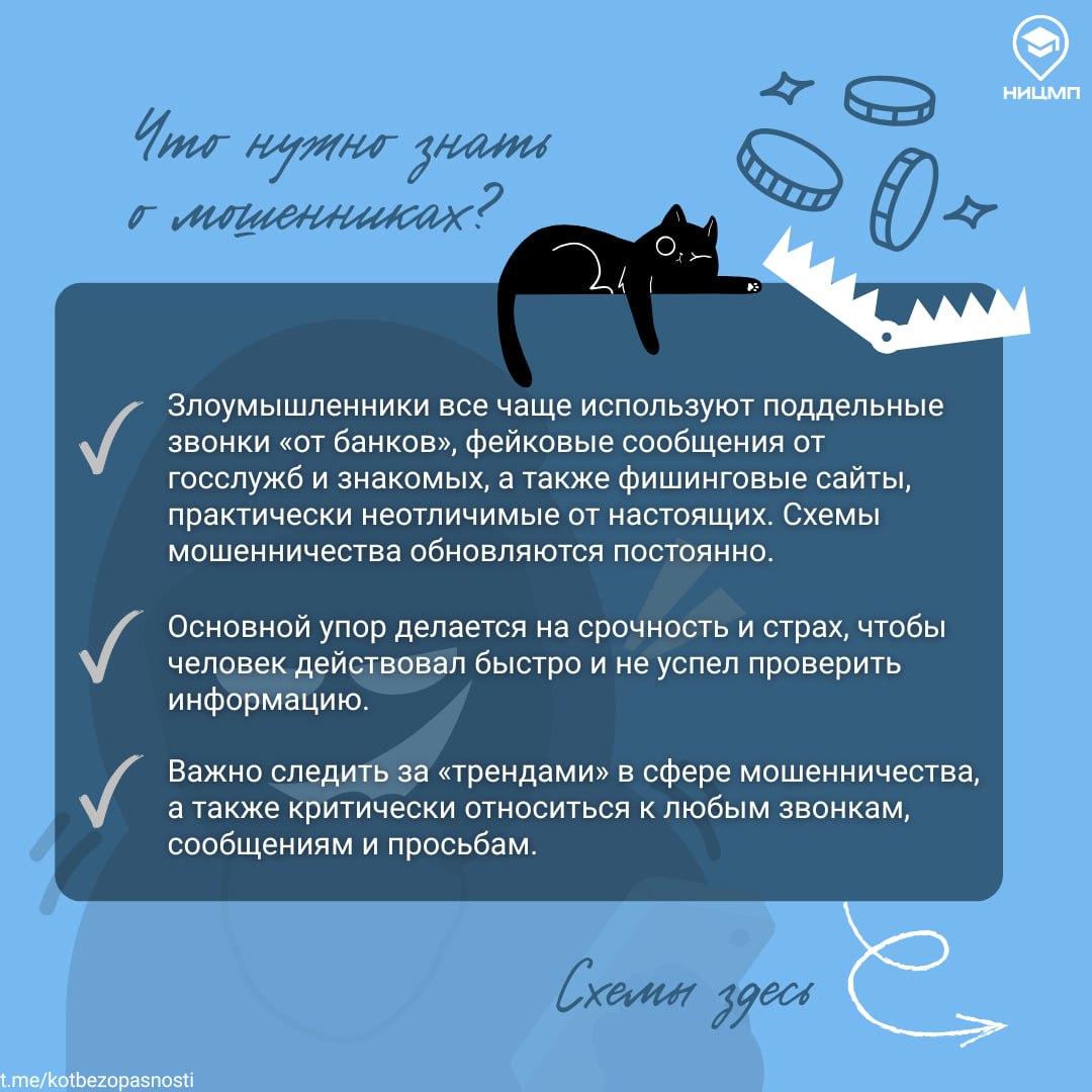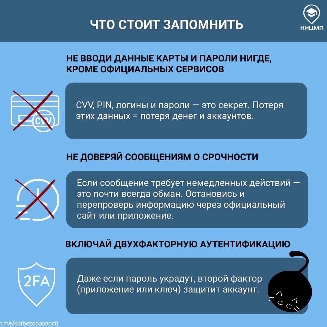 Даже если ты уверен в своей киберграмотности и думаешь, что легко распознаешь обман, расслабляться не стоит. Мошенники постоянно меняют тактику, давят на эмоции, играют на спешке и доверии. Поэтому важно всегда оставаться начеку, перепроверять информацию и не поддаваться на манипуляции.