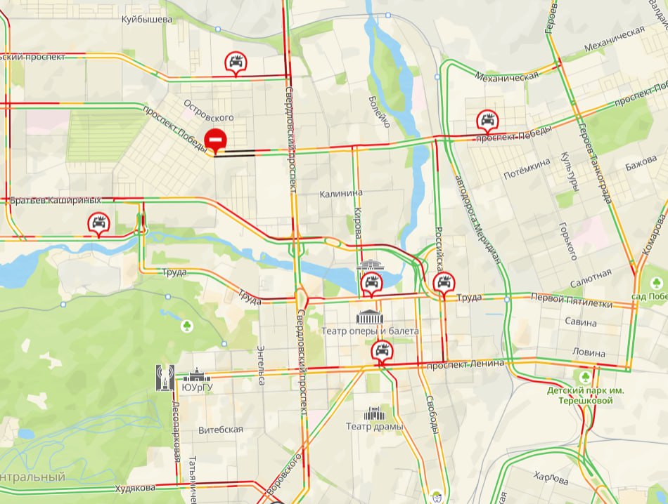 Движение затруднено на проспекте Ленина, Свердловском, Труда, Худякова и Российской. Также «стоят» Кашириных, проспект Победы и Комсомольский. В центре города движение затрудняют несколько аварий.