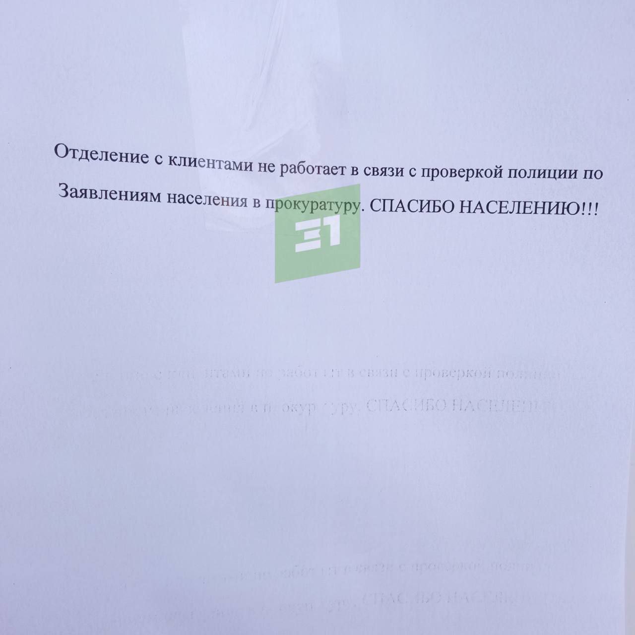 «Отделение с клиентами не работает в связи с проверкой полиции. Спасибо населению!!!»