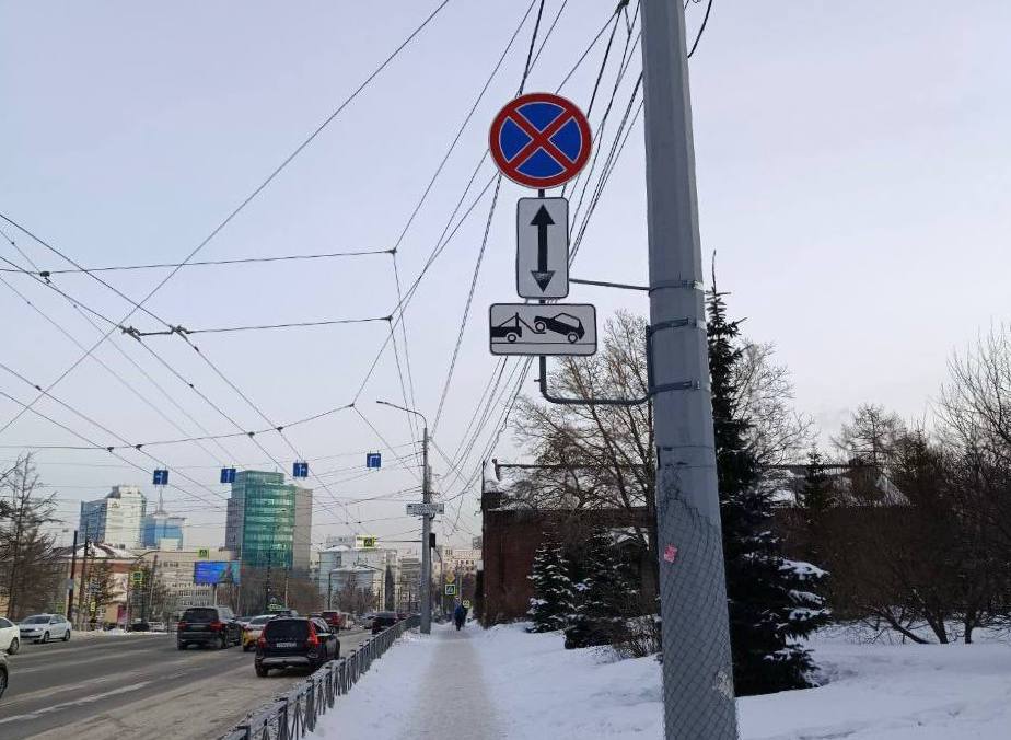 На проезжей части у дома № 5 с сегодняшнего дня работают знаки о запрете остановки, а также о работе эвакуатора в этом месте.