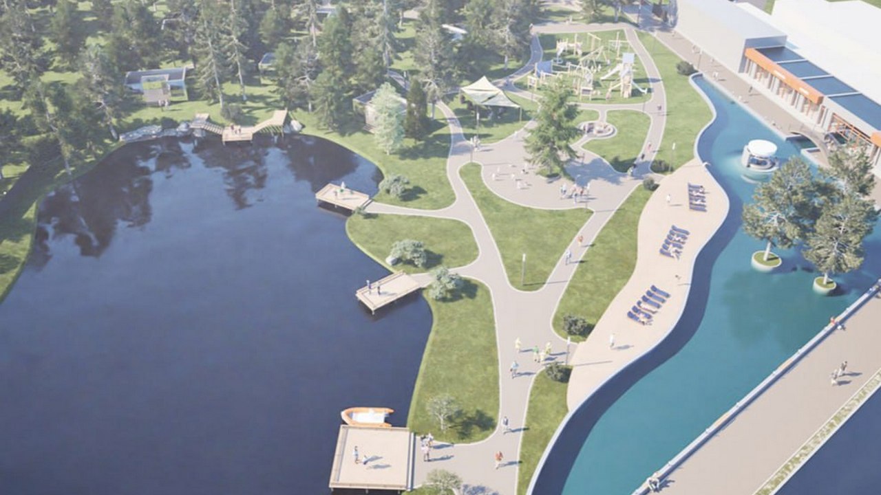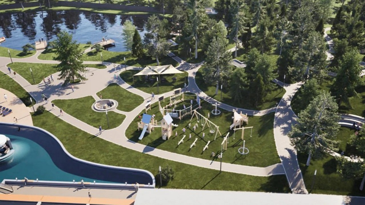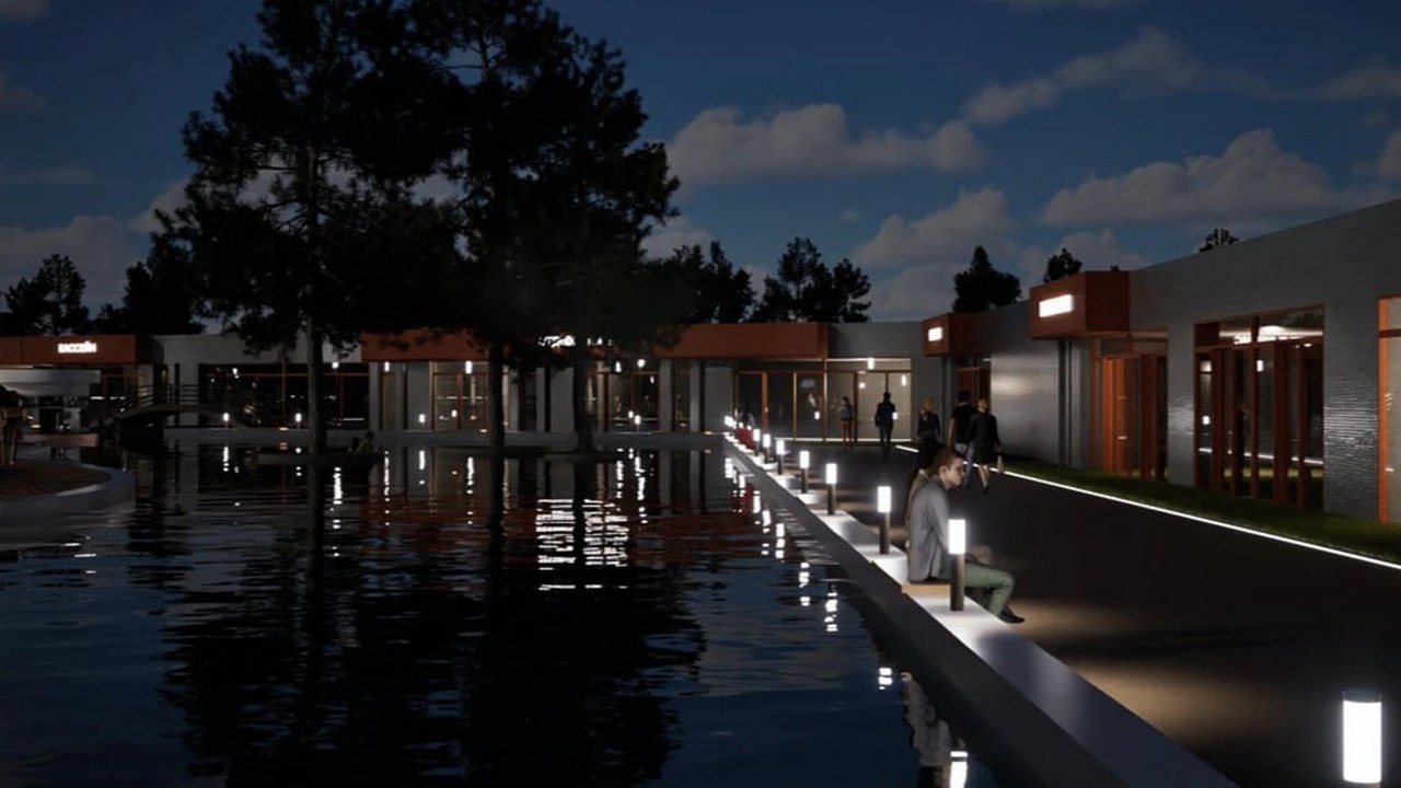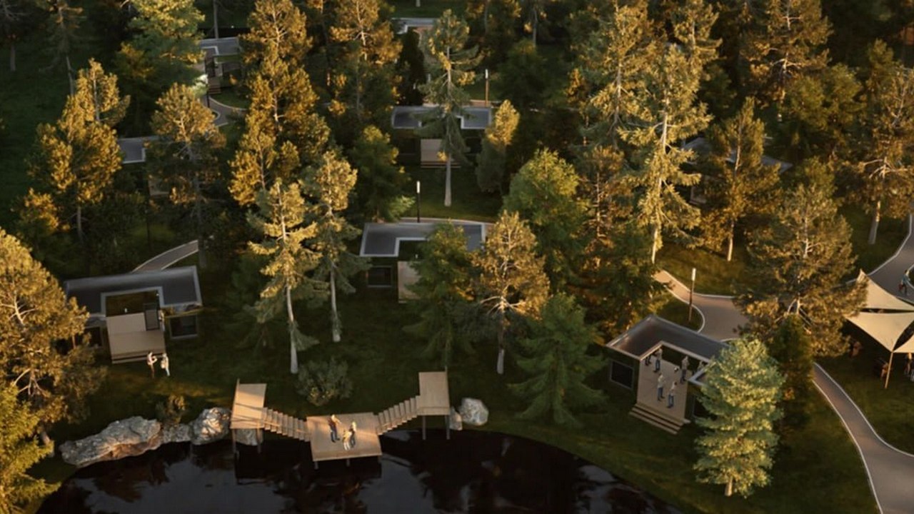 В сосновом бору появятся модульные домики с зеркальными фасадами. В проекте предусмотрен искусственный пруд, где можно разводить рыбу. А еще термальный бассейн под открытым небом, который будет работать круглый год. Для детей сделают подогреваемую игровую зону.