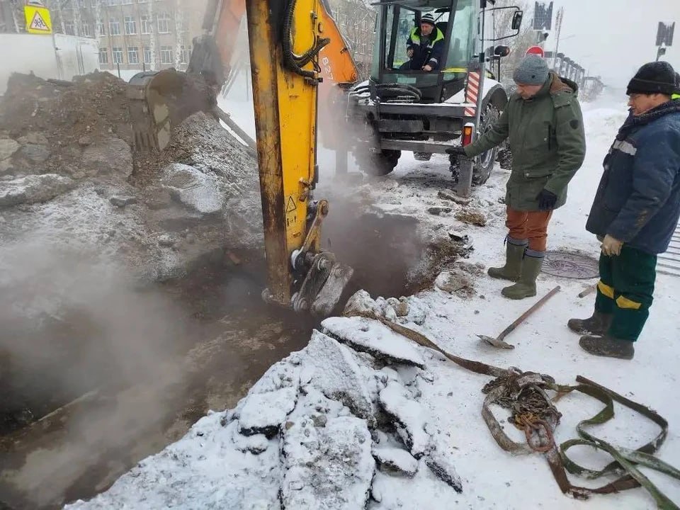 К середине дня рабочим удалось обнаружить место прорыва на теплотрассе. Прохудилась стальная труба на глубине 1,5 метра. Ее рассчитывают заварить.