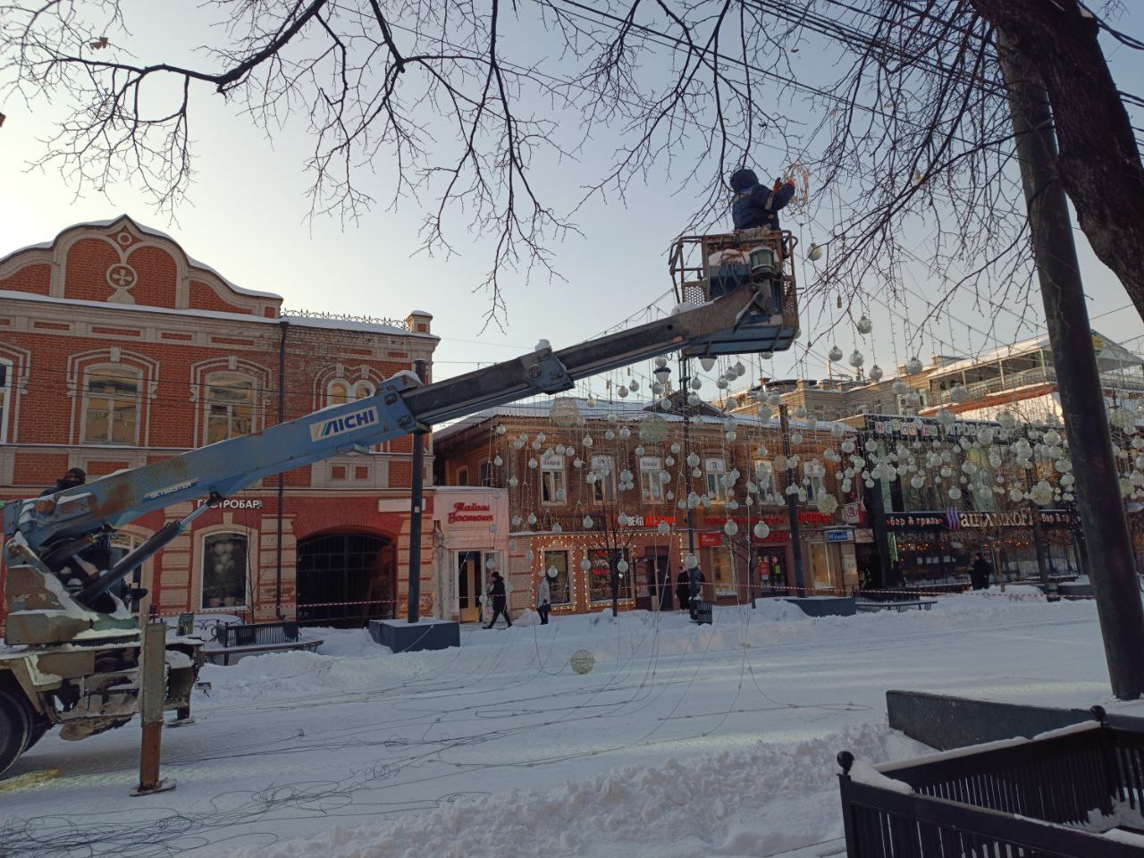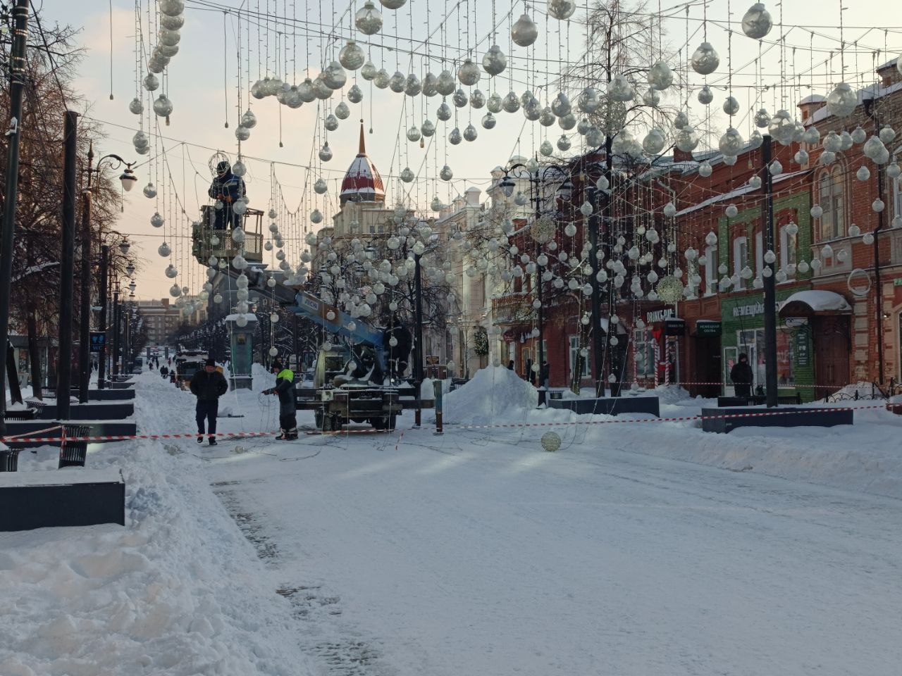 Тем временем на Кировке до сих пор убирают световой потолок. Рабочие говорят, что гигантскую гирлянду будут сворачивать полностью. Планируется, что она украсит общественные пространства других районов города.