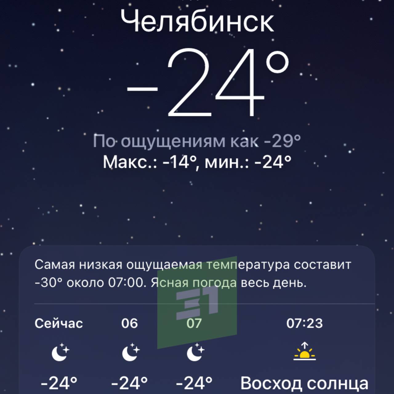 Сейчас в городе -24. Погодные сервисы указывают, что «по ощущениям» -29 градусов.