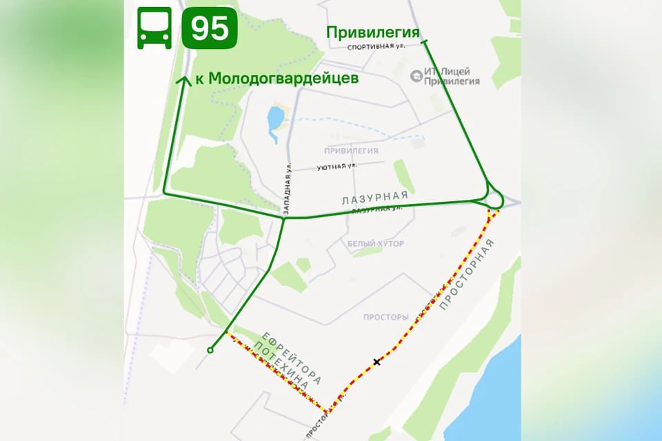Автобусы больше не будут ездить по улицам Просторной и Ефрейтора Потехина. Вместо этого они двинутся по улице Лазурной. При этом в маршруте сохранятся остановки «Ефрейтора Потехина» и «Брусничная».