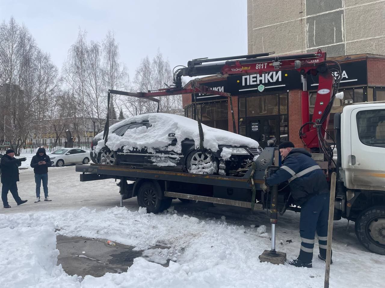 Сегодня эвакуировали еще один разукомплектованный и брошенный автомобиль с парковки возле дома № 80Б по Комсомольскому проспекту.