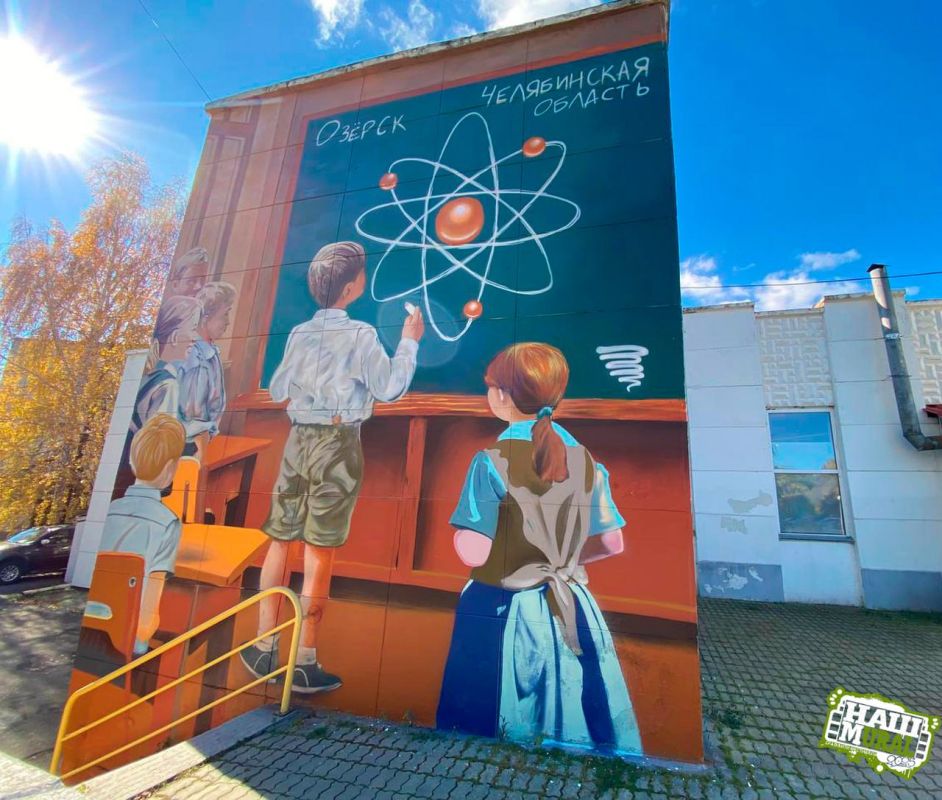 Уличный рисунок можно увидеть на фасаде здания кинотеатра "Октябрь" в Озерске. Огромную картину жителям подарил художник Николай Касаткин, он сам родом из закрытого города.В основе сюжета рисунка – школьный класс. Мальчик у доски, где изображен мирный...