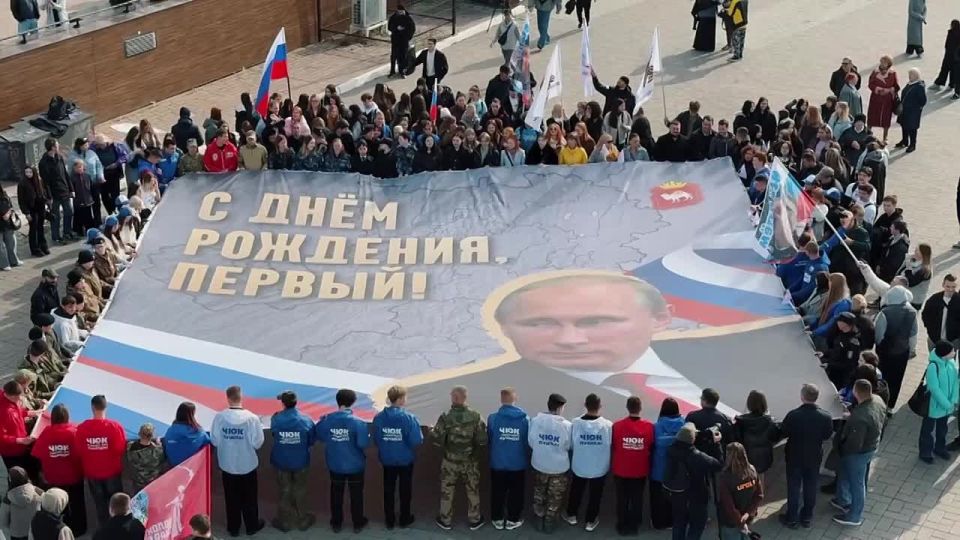 Порядка 300 активистов устроили в центре Челябинска флешмоб в честь дня рождения президента Владимира Путина. Они развернули огромную поздравительную открытку с фотографией лидера страны и надписью: «С днем рождения, Первый!».— Участие во флешмобе...