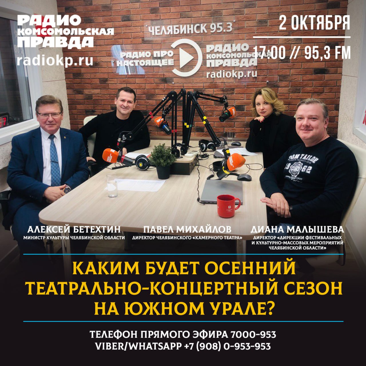 Южный Урал встречает новый театрально-концертный сезон насыщенной программой юбилейных событий и новаторских проектов. В этом году региональные театры празднуют значимые даты, представляют свежие постановки и открывают творческие лаборатории. Что нас ждет в этом сезоне? Сегодня, 2 октября, в 17:00 гости эфира на радио "Комсомольская правда" (95.3FM) - министр культуры Челябинской области Алексей БЕТЕХТИН, директор челябинского Камерного театра Павел МИХАЙЛОВ и директор Дирекции фестивальных и культурно-массовых мероприятий Челябинской области Диана МАЛЫШЕВА