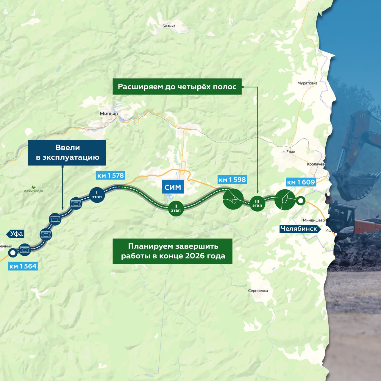 Реконструированный участок федералки сократит время в пути как минимум на час за счёт сглаженного горного рельефа, а более 150 км «Урала» в регионе станут четырёхполосными.