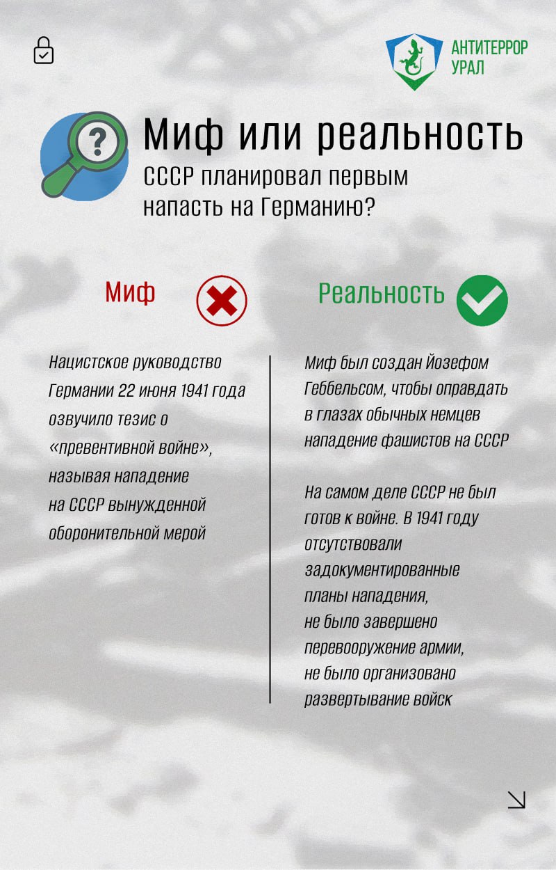 «Антитеррор Урал» в рамках рубрики #Миф_или_Реальность рассказывает о попытках подмены исторических фактов фальсифицированными выдумками о Великой Отечественной войне.