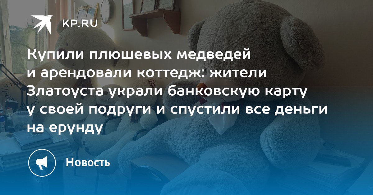 Плюшевые мишки на миллионВ Златоусте двое парней украли у своей подруги банковскую карту, на которой был миллион рублей. За пару дней они спустили почти все на аренду квартиры, одежду, телефоны и... огромных плюшевых медведей. Игрушками они хотели...