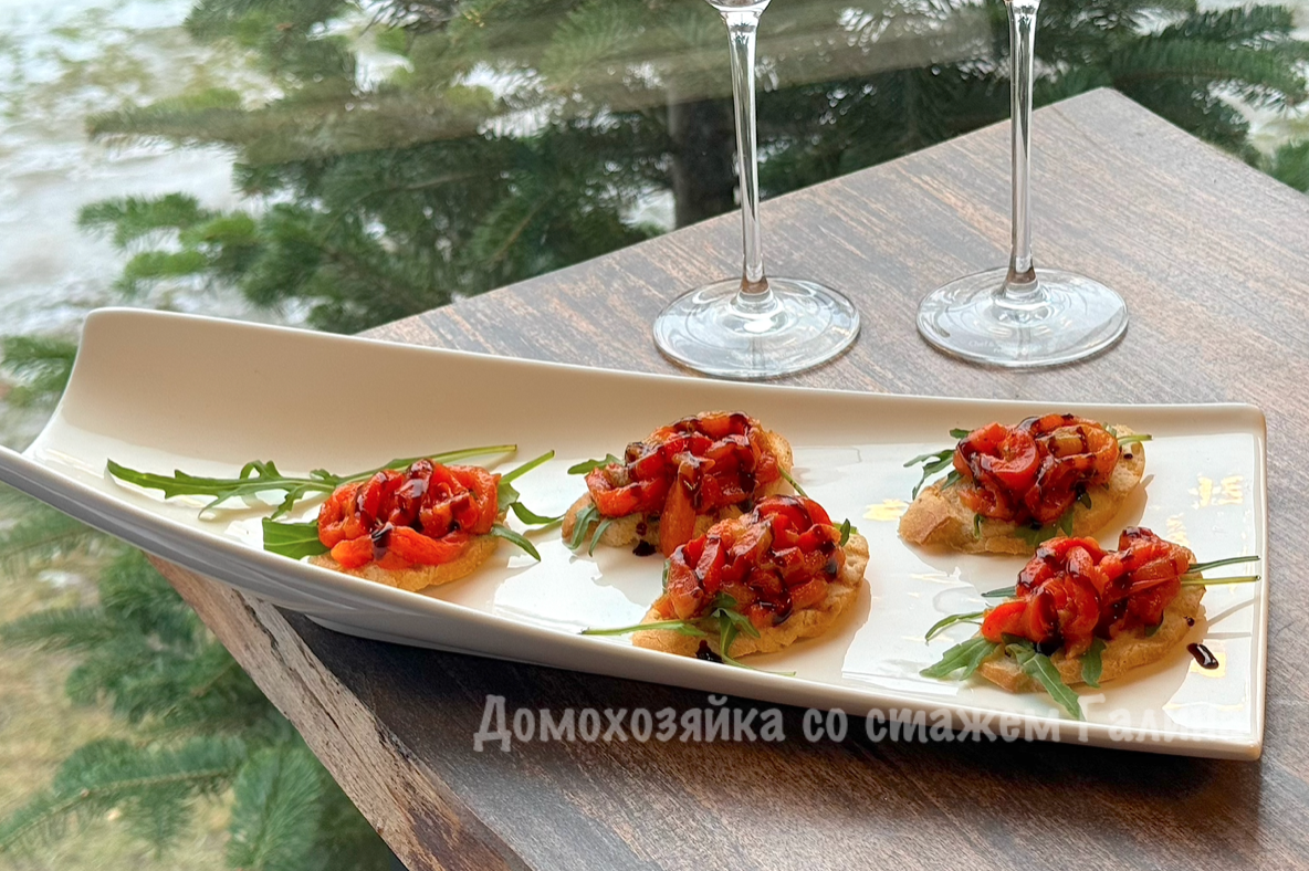 Хлебные багеты нарезаются тонкими ломтиками и слегка поджариваются. На каждый ломтик укладывается свежая рукола или другой листовой салат, и сверху щедро выкладываются очищенные перцы. Завершающий штрих – бальзамический соус, который придаст этому блюду презентабельный вид и уникальный вкус.