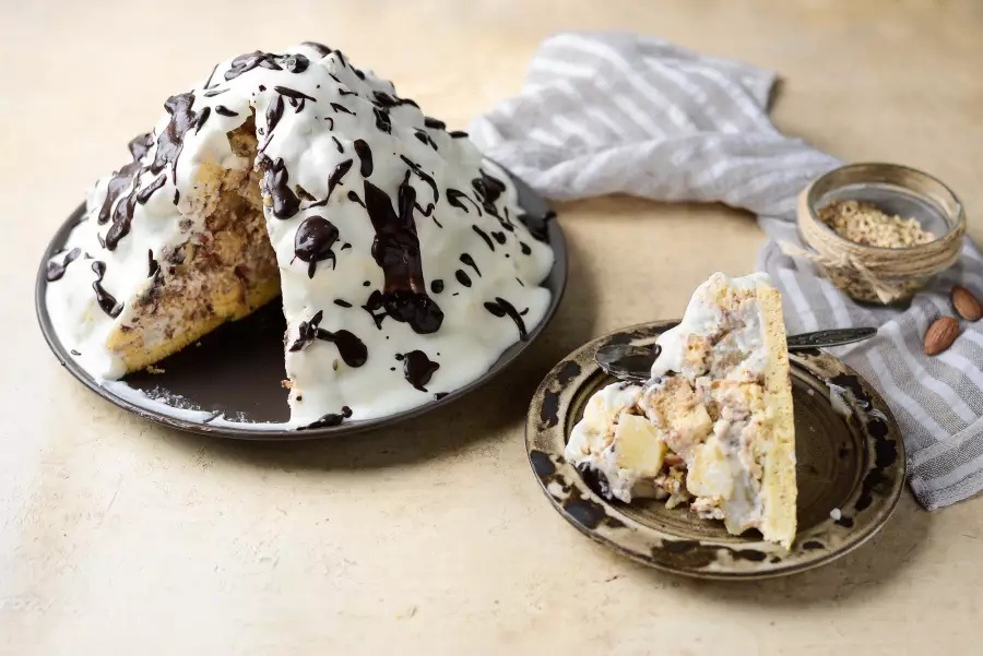 5. Сборка торта: Крем делится пополам, одна часть смешивается с измельченными орехами. На сервировочную тарелку выкладывается корж, сверху намазывается немного крема, добавляются кусочки ананаса и оставшиеся орехи. Затем речь идет о слое из кусочков коржа, окунутых в ореховый крем, что создает пирамидальную структуру.