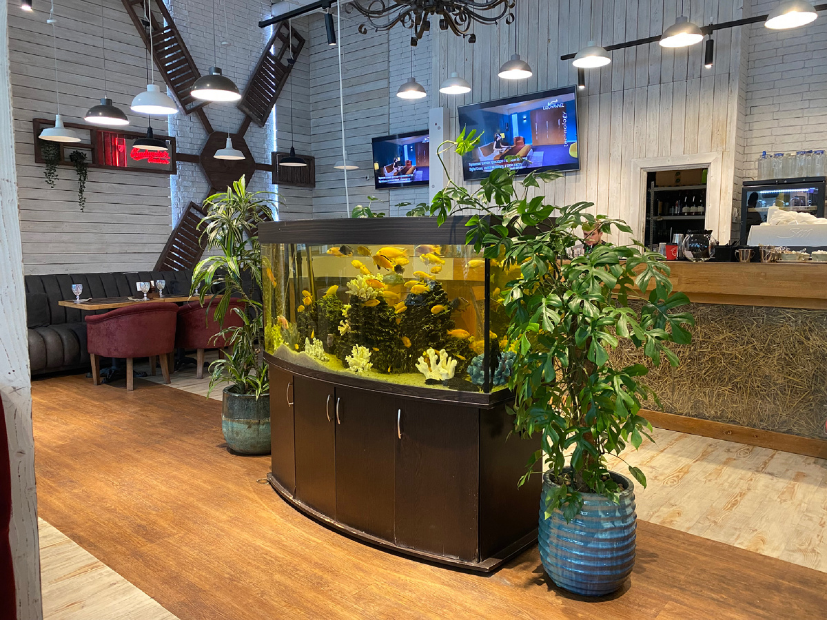 Интерьер заведения создает атмосферу уюта: белые перекрытия, столбы и оригинальные аквариумы с золотыми рыбками. Однако стоит обратить внимание на необычное расположение столов, где таблички призывают гостей быть внимательными к своим шагам. Визит в Хинкальную — это не только гастрономический опыт, но и визуальное удовольствие.