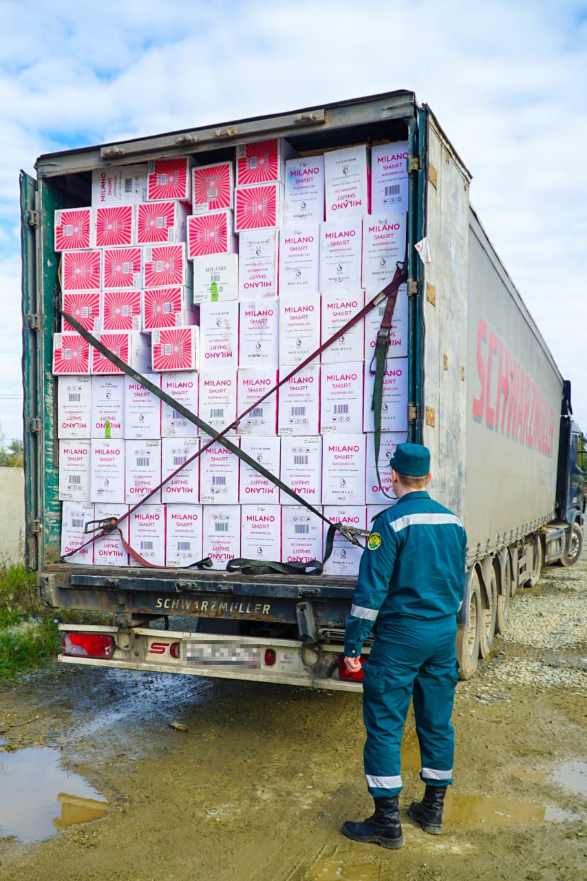 Более 1 млн пачек сигарет везли под видом товаров народного потребления. Табачная продукция включена в перечень стратегически важных товаров, перемещение которых через госграницу возможно только по лицензии Росалкогольтабакконтроля. Разрешающих документов на товар у перевозчика не было.