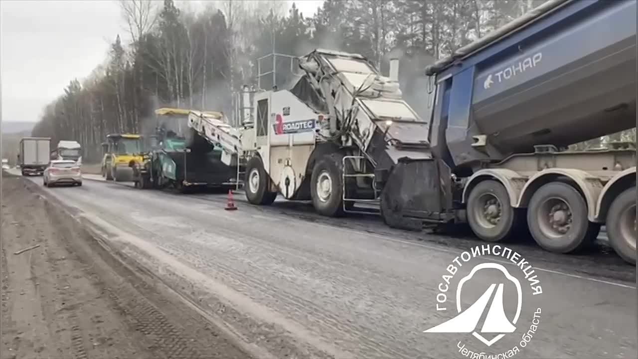 Между Златоустом и Саткой идут дорожные работы. На участке 1722 км укладывают асфальт.