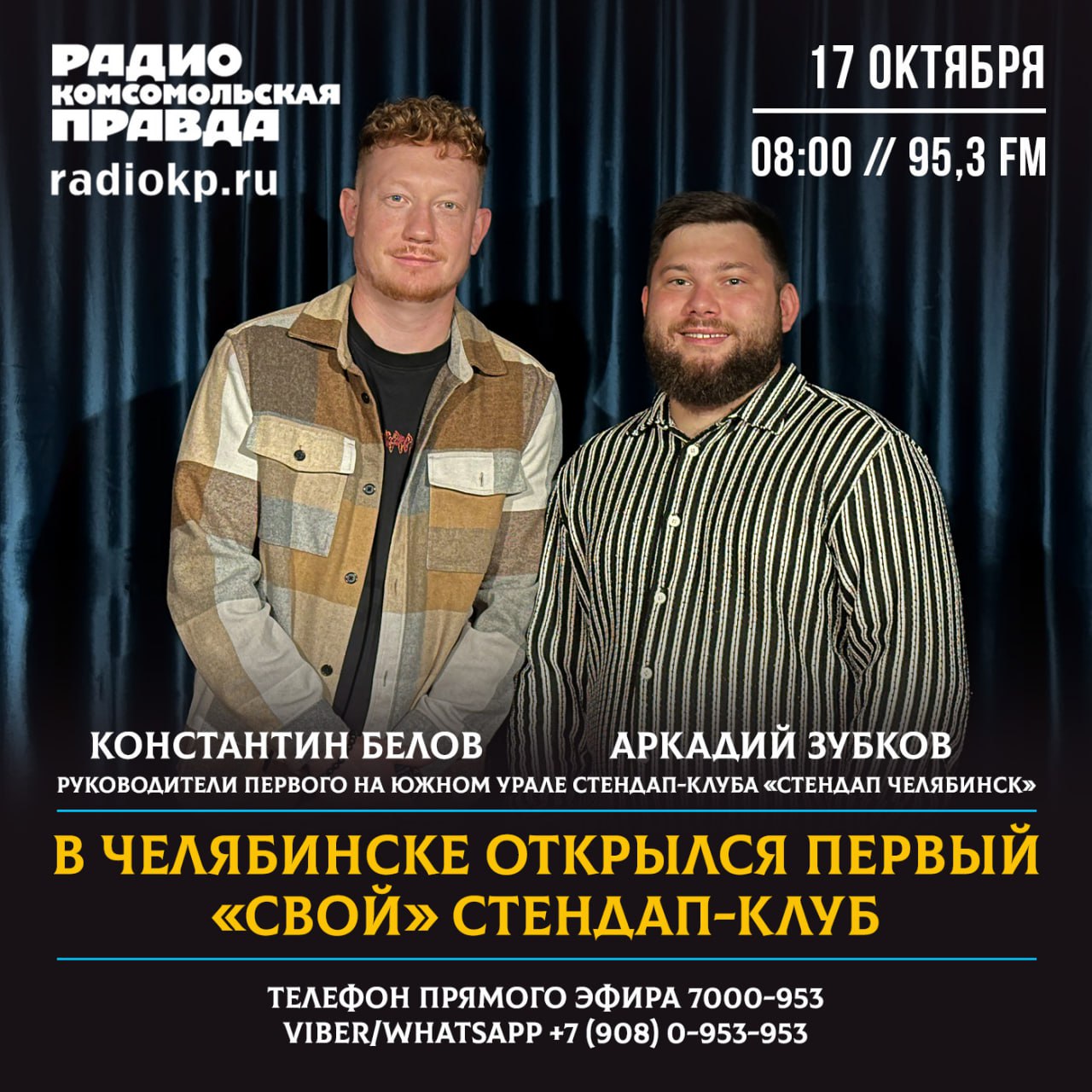 В Челябинске открылся первый "свой" стендап-клуб. В утреннем эфире узнаем, правда ли то, что в стендапе всех дискриминируют, за несмешную шутку могут освистать и выгнать со сцены, а актуальность и остроту шуток оценивает не только преданная публика, но и "серьёзные люди в штатском"? Об этом и многом другом спросим руководителей первого на Южном Урале стендап-клуба “Стендап Челябинск” Аркадия ЗУБКОВА и Константина БЕЛОВА. Включай радио "Комсомольская правда" (95.3 FM) в пятницу, 17 октября, в 8:00!